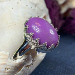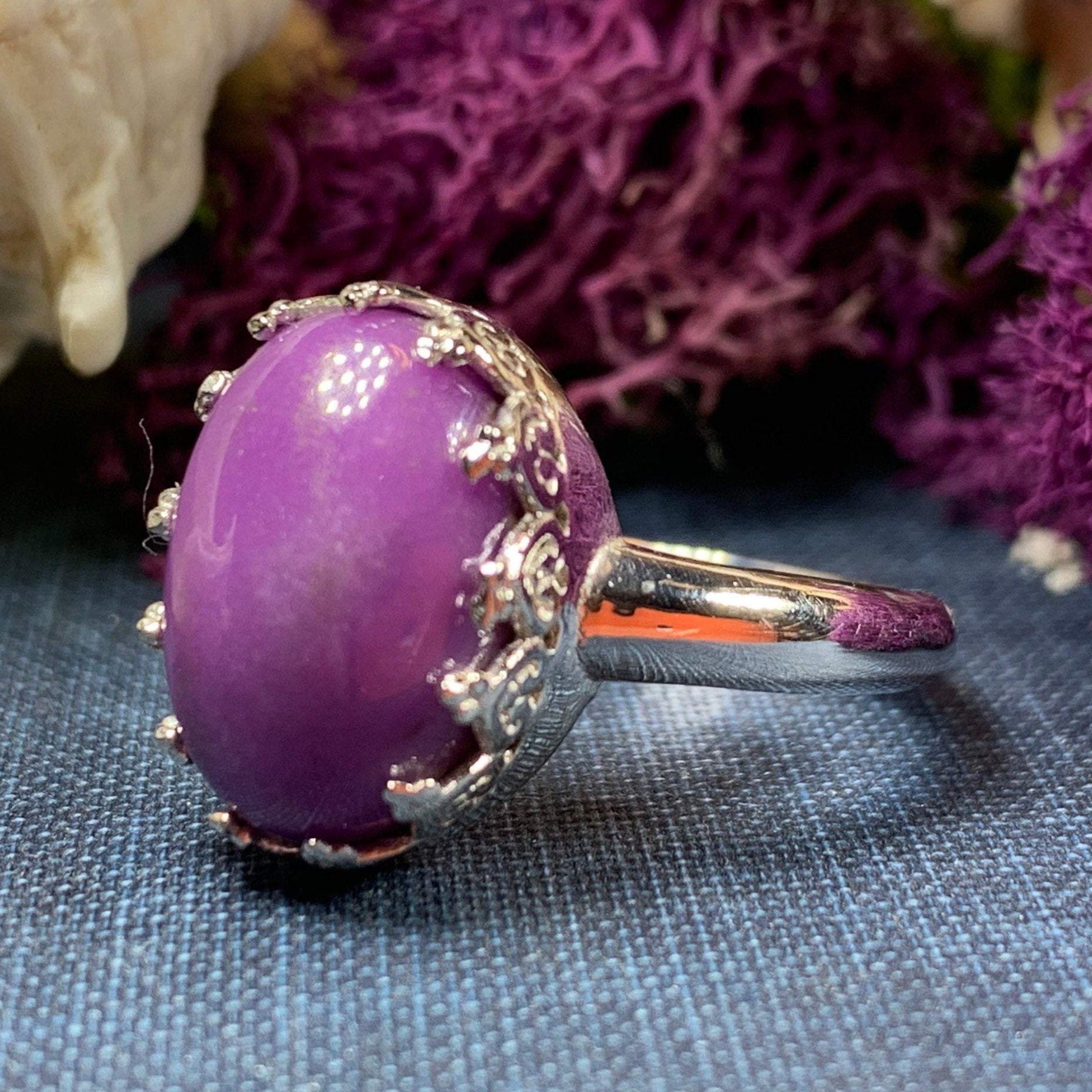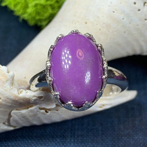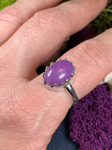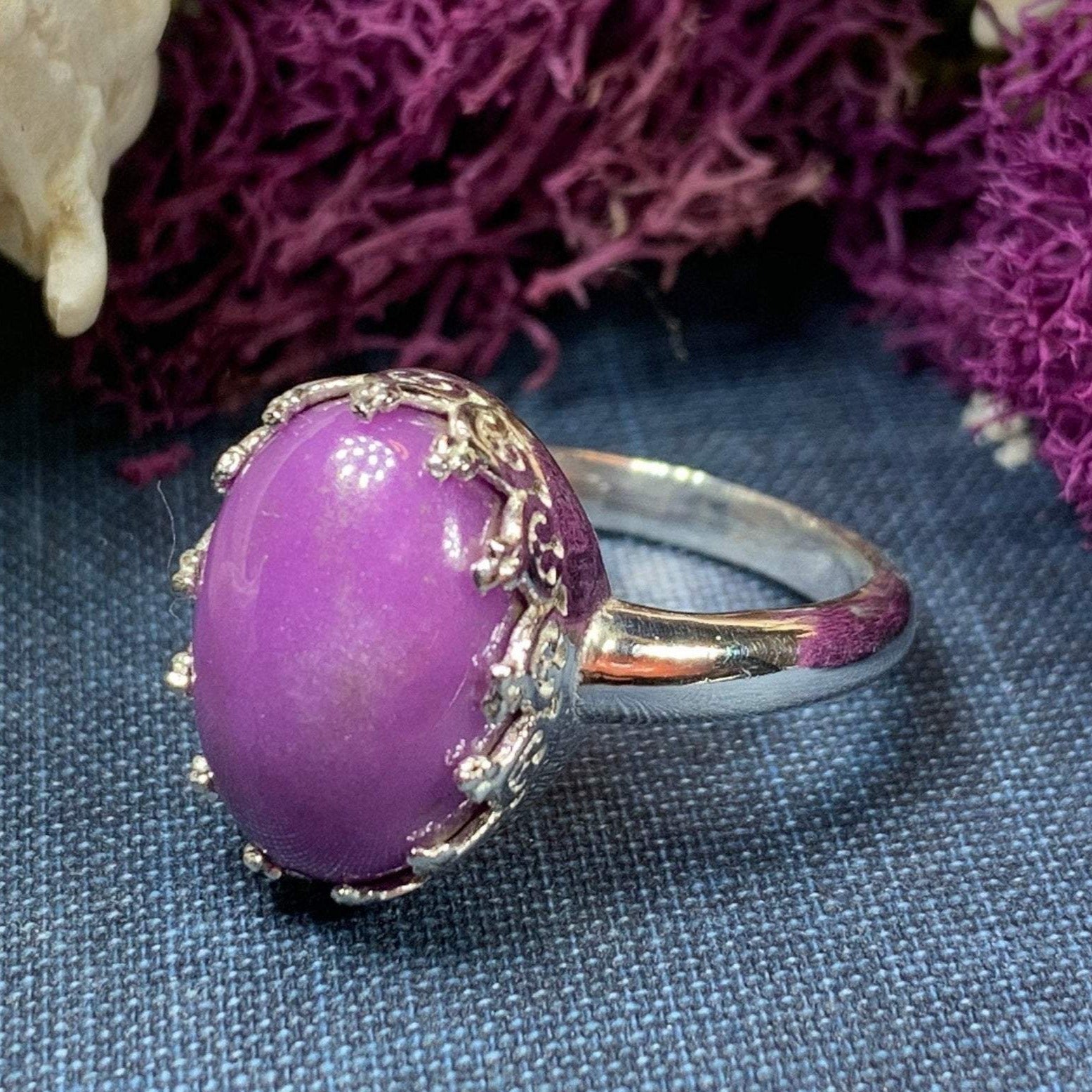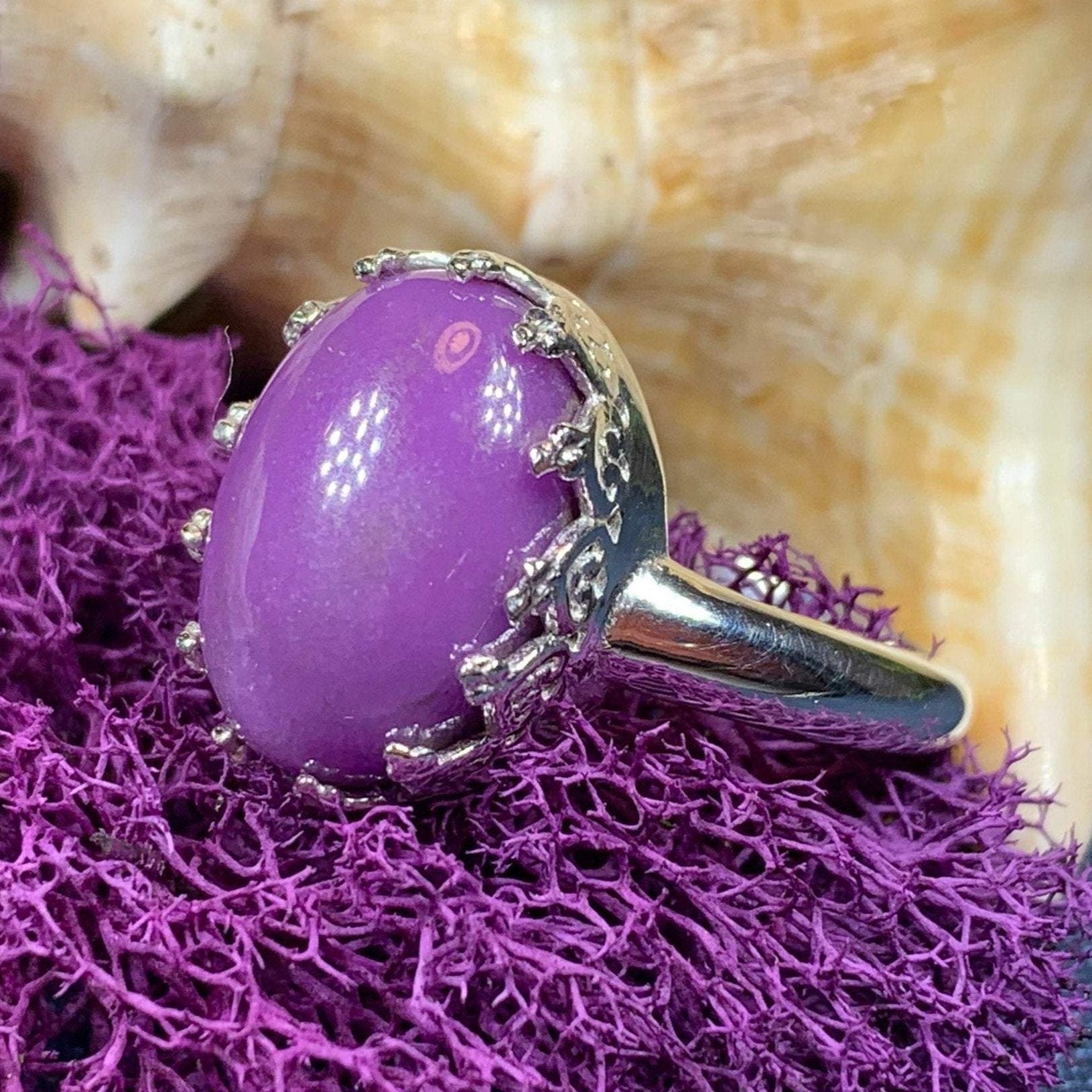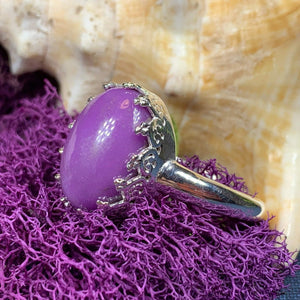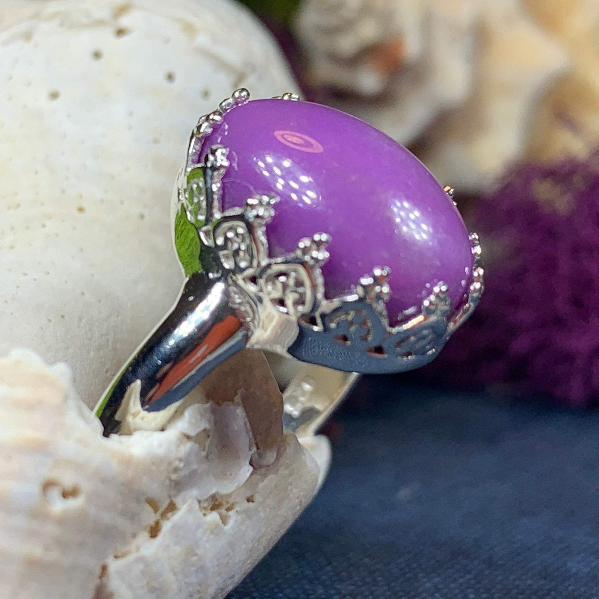 A unique design of a lovely natural amethyst gemstone accented with six diamond cubic zirconias in a prong setting - a delicate and feminine ring that celebrates the beauty of spring - solid sterling silver.
