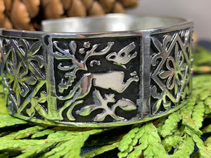 Stunning! Our Pewter Celtic Stag Bangle Bracelet features an ancient Celtic design that goes back thousands of years, with a stag, lion and hound! Made of heavy, solid pewter that will never tarnish and designed to last a lifetime. A beautiful gift!