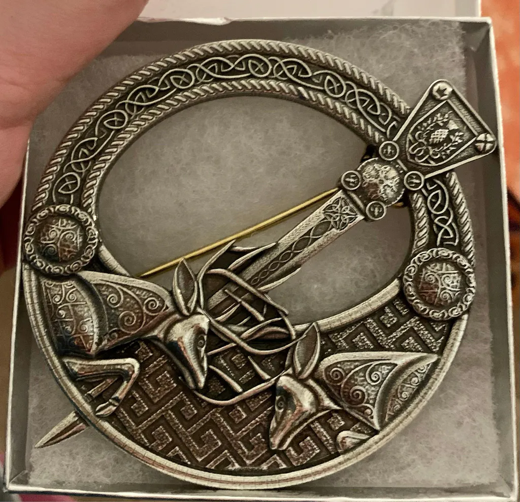 A heavy pin that is perfect for a kilt, tartan, coat or sweater.