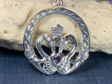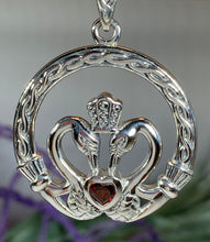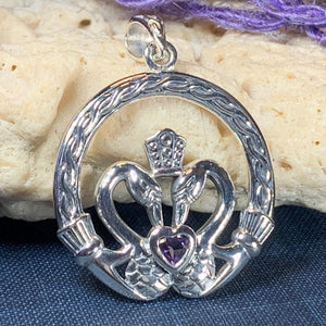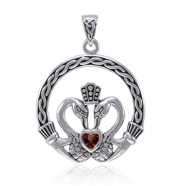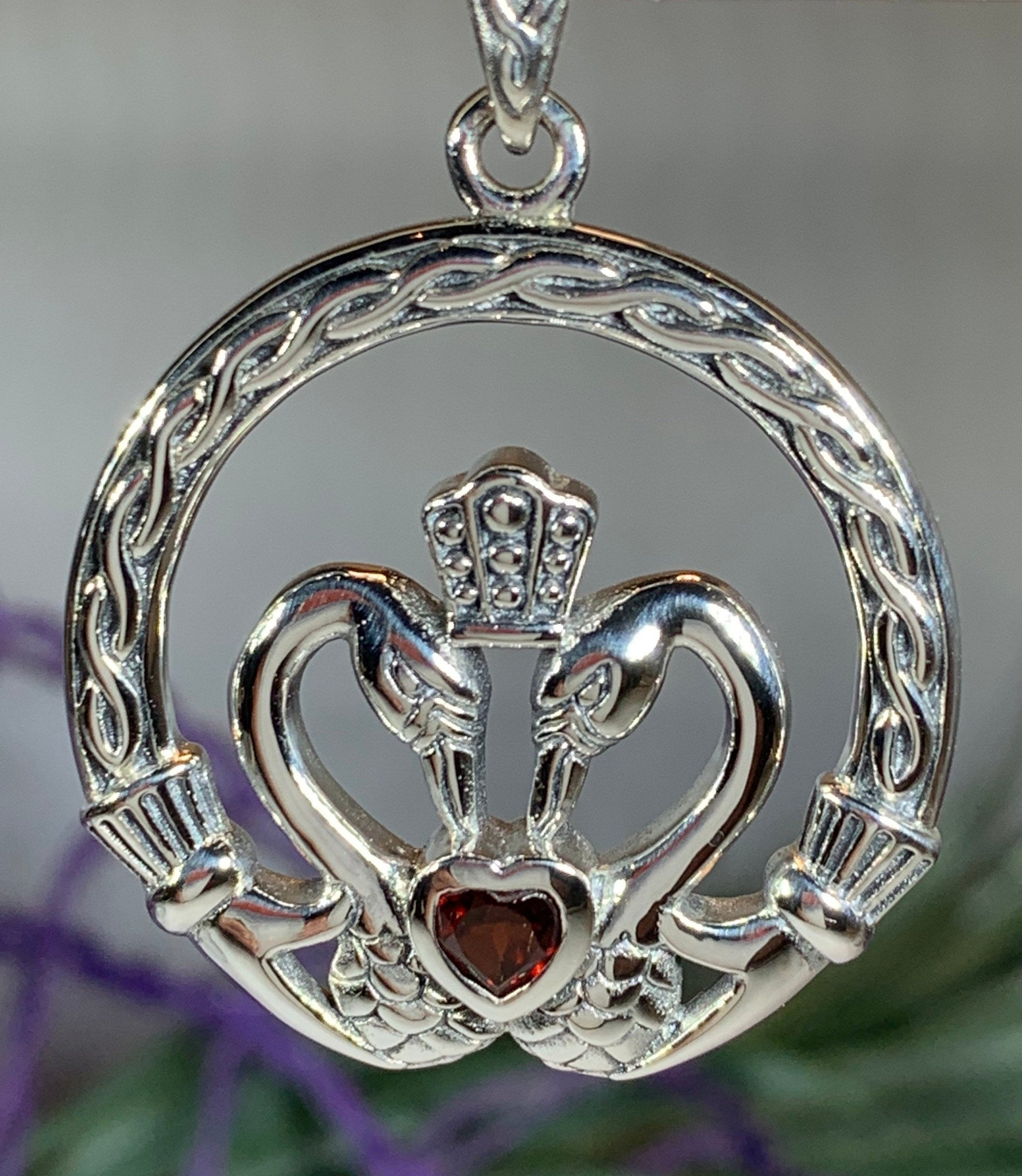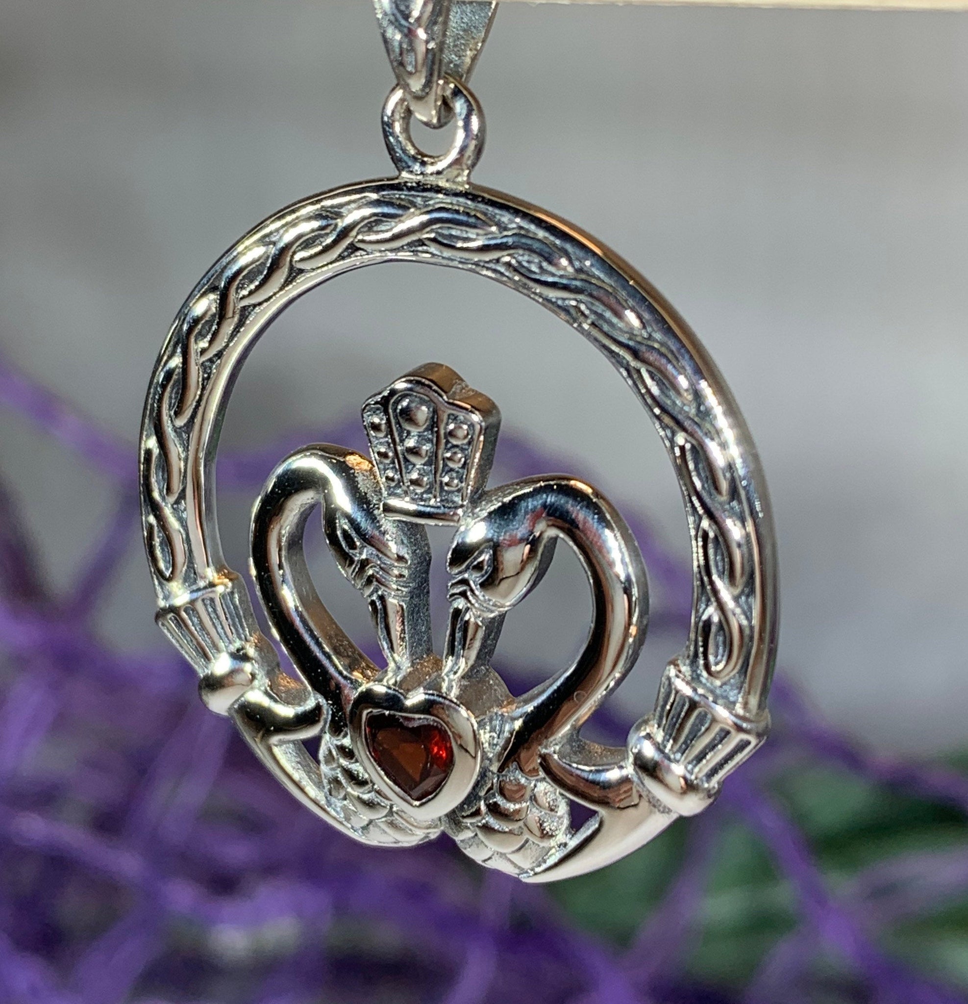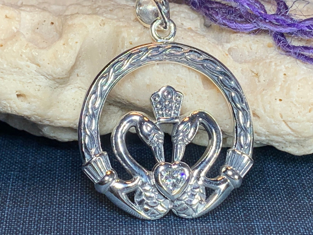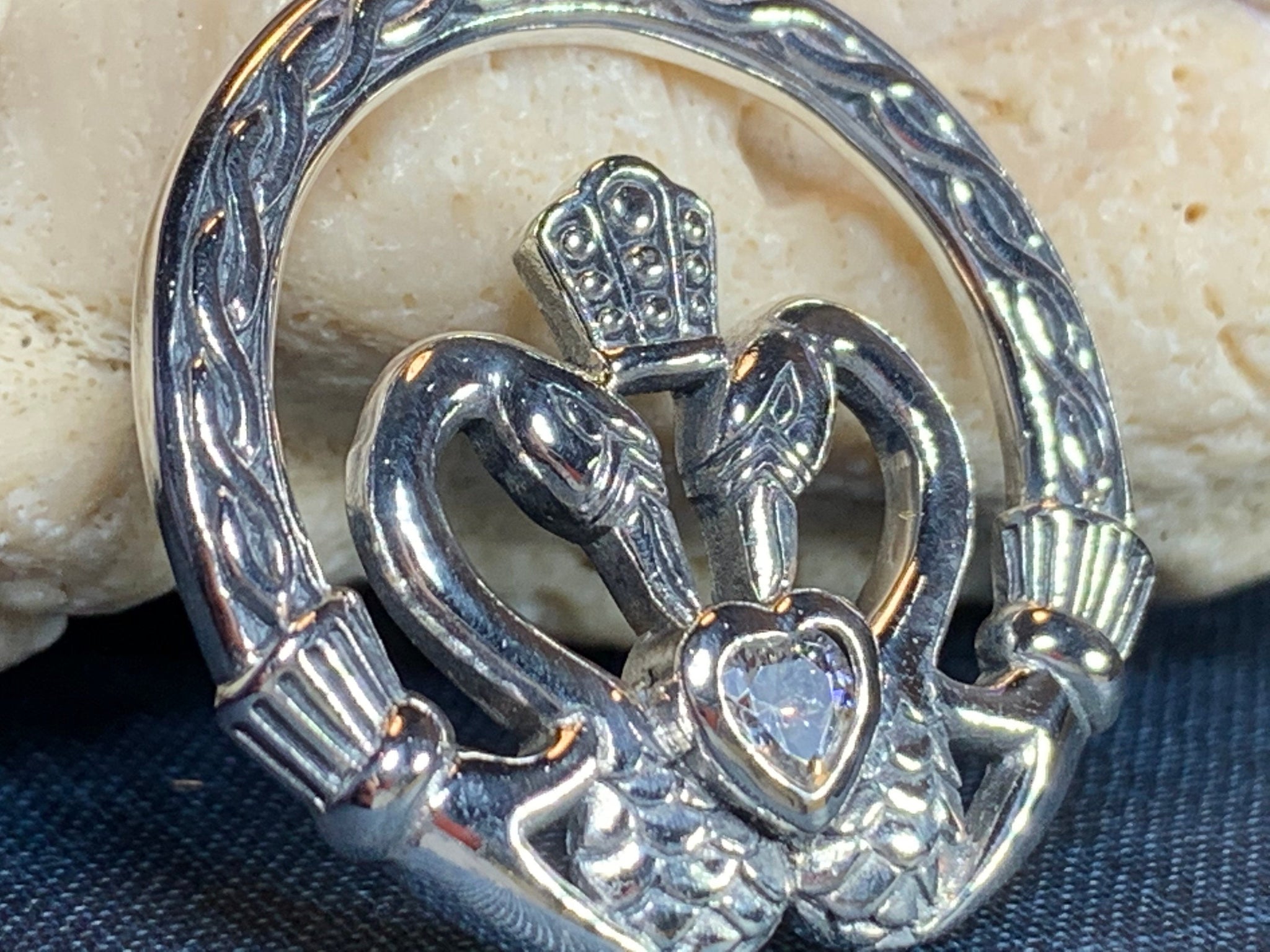 This is no ordinary Claddagh - this beautiful piece has intricate knotwork surrounding and elaborate Claddagh designed from two swans with their necks creating a heart shape and with a detailed crown - you can see the little Celtic weave and crown details.The cuffs on the hands even have beautiful detailing!