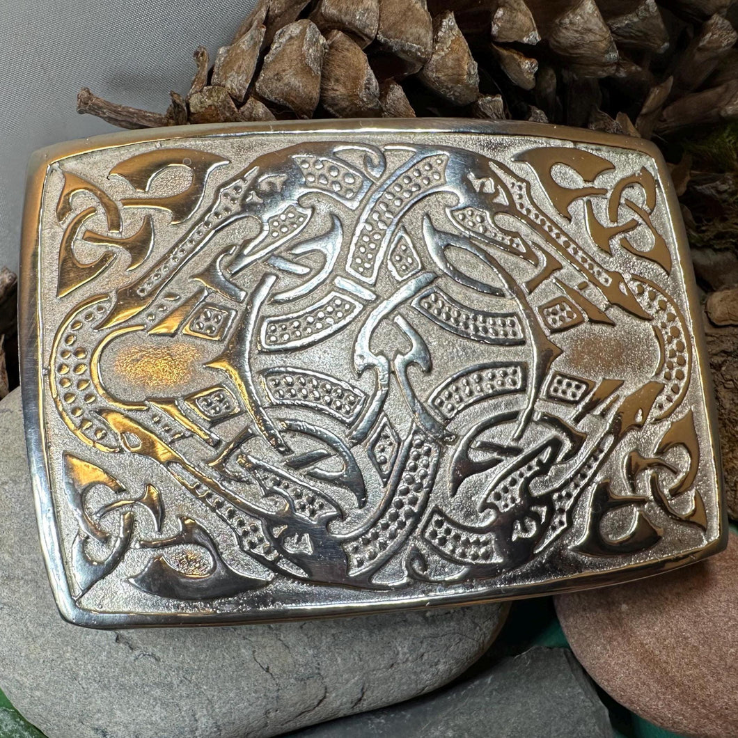 Polished pewter with intricate Celtic knotwork and traditional Celtic zoomorphic (animal and bird) design. A beautiful buckle that will get attention and become your favorite go-to piece for a rich Celtic look!