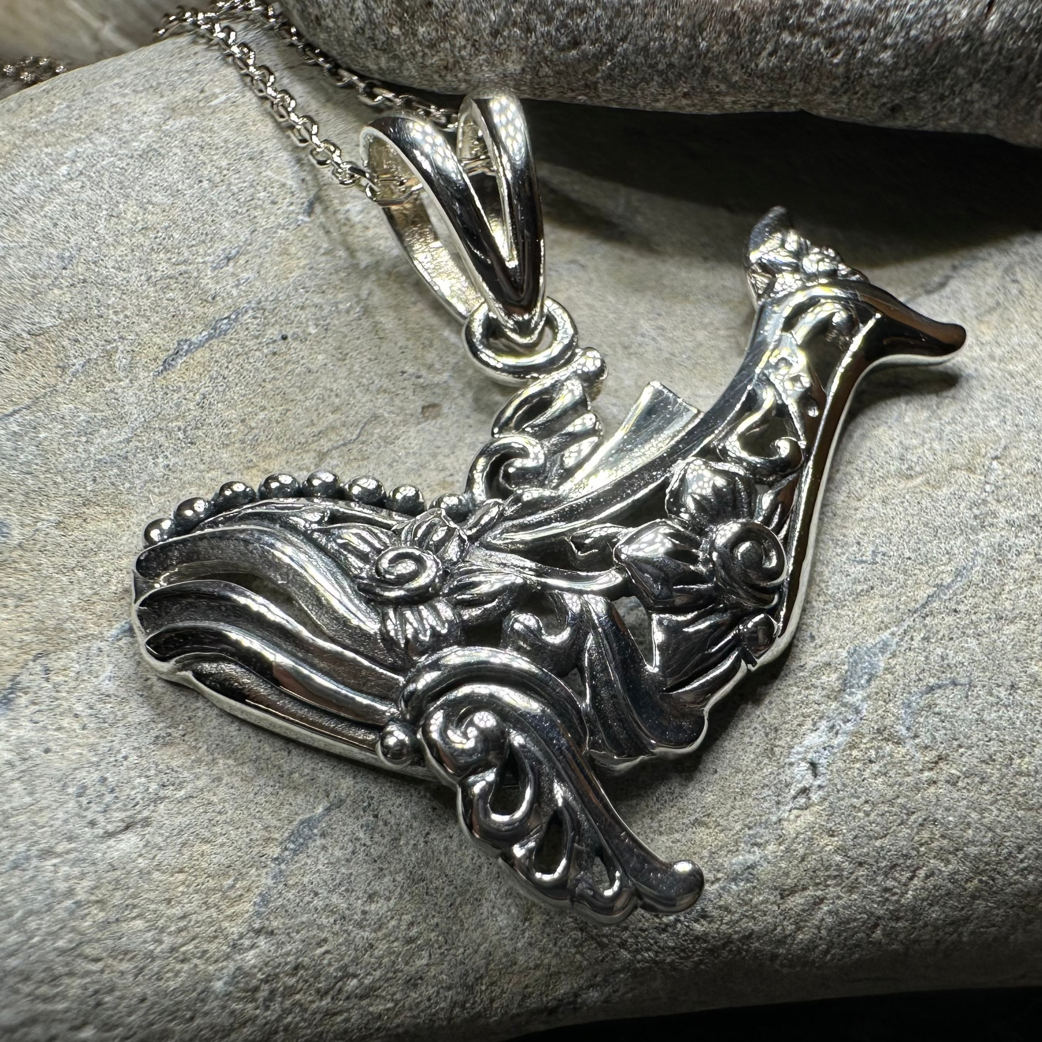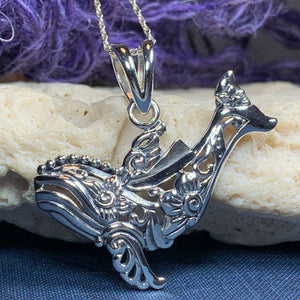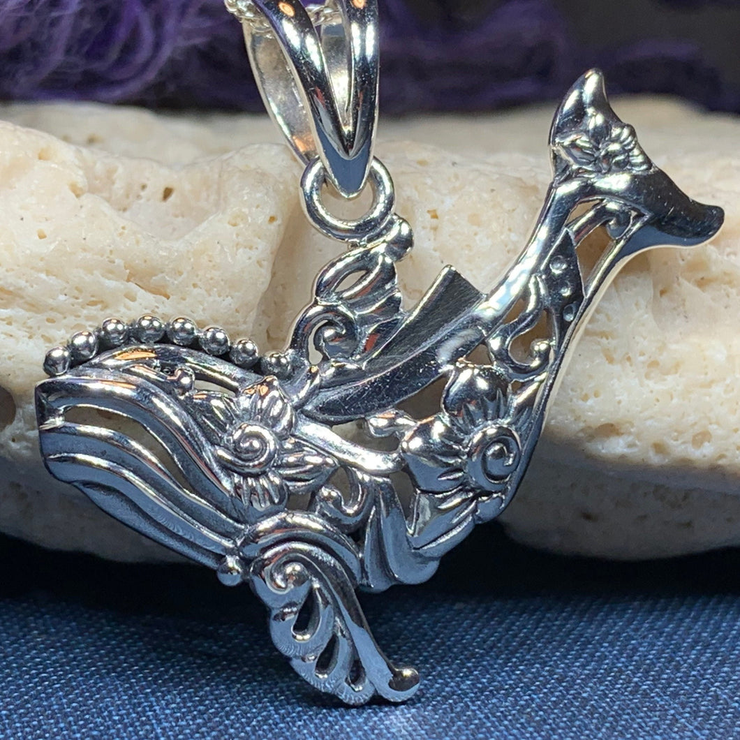 Meticulously crafted from fine sterling silver with Celtic knotwork and blooming flower detailing, the Celtic Whale Silver Pendant captures the power of the whale and adds some nautical charm to your day. This beautiful artisan necklace will delight anyone who loves the amazing creatures of the sea.