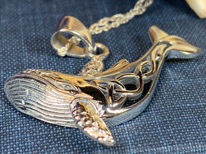 A lovely sterling silver whale 1 1/4" x 1" pendant on an 18" sterling silver chain. Hallmarked 925