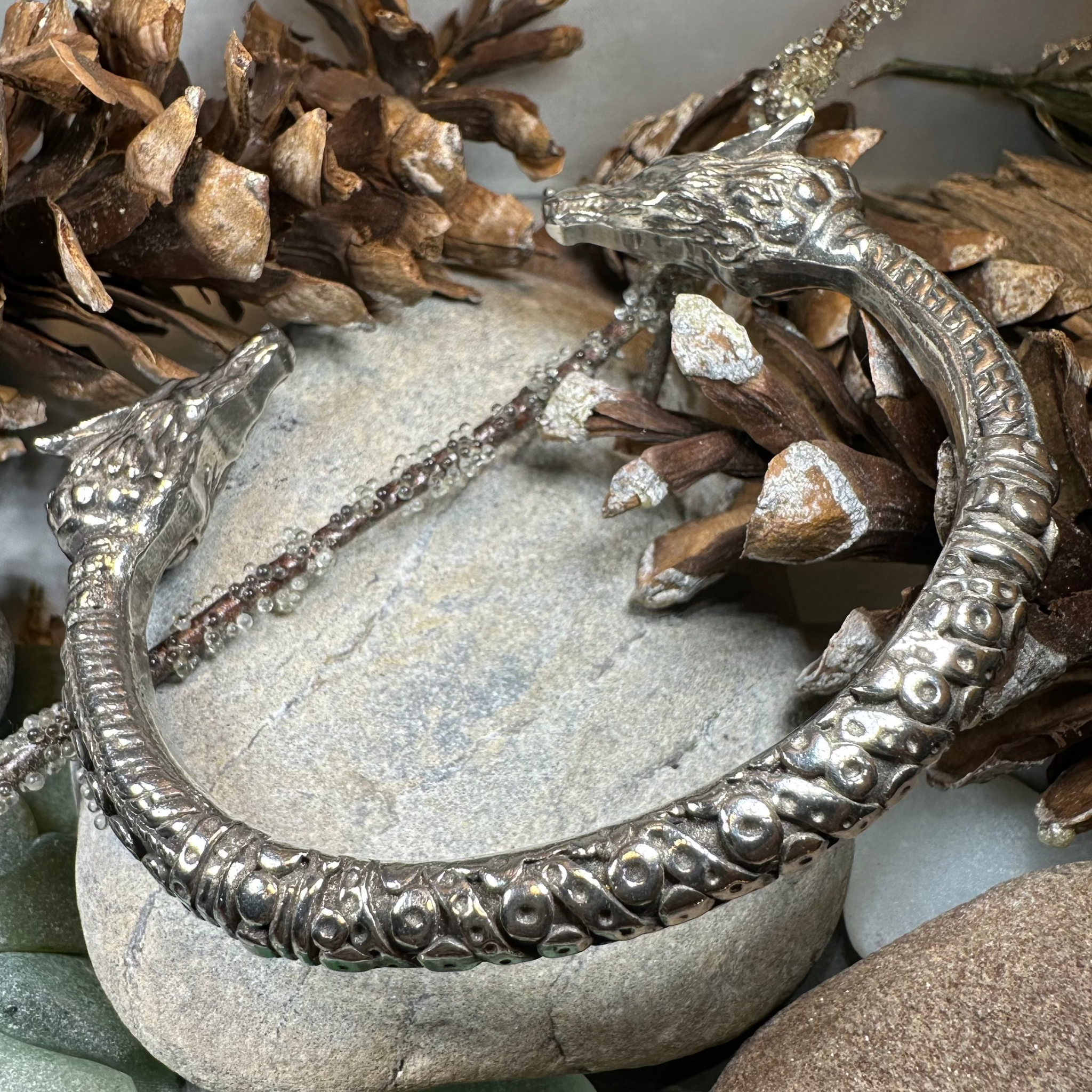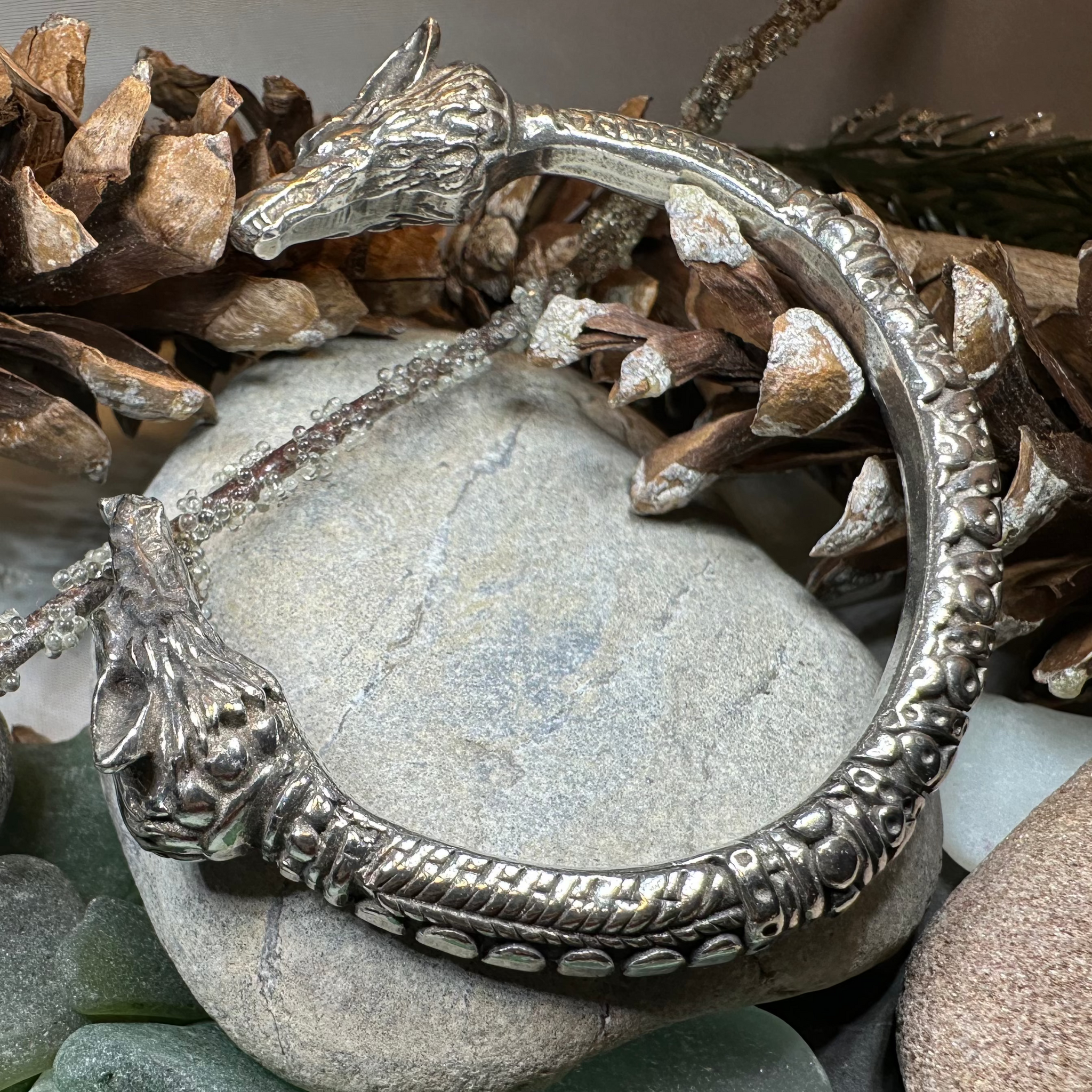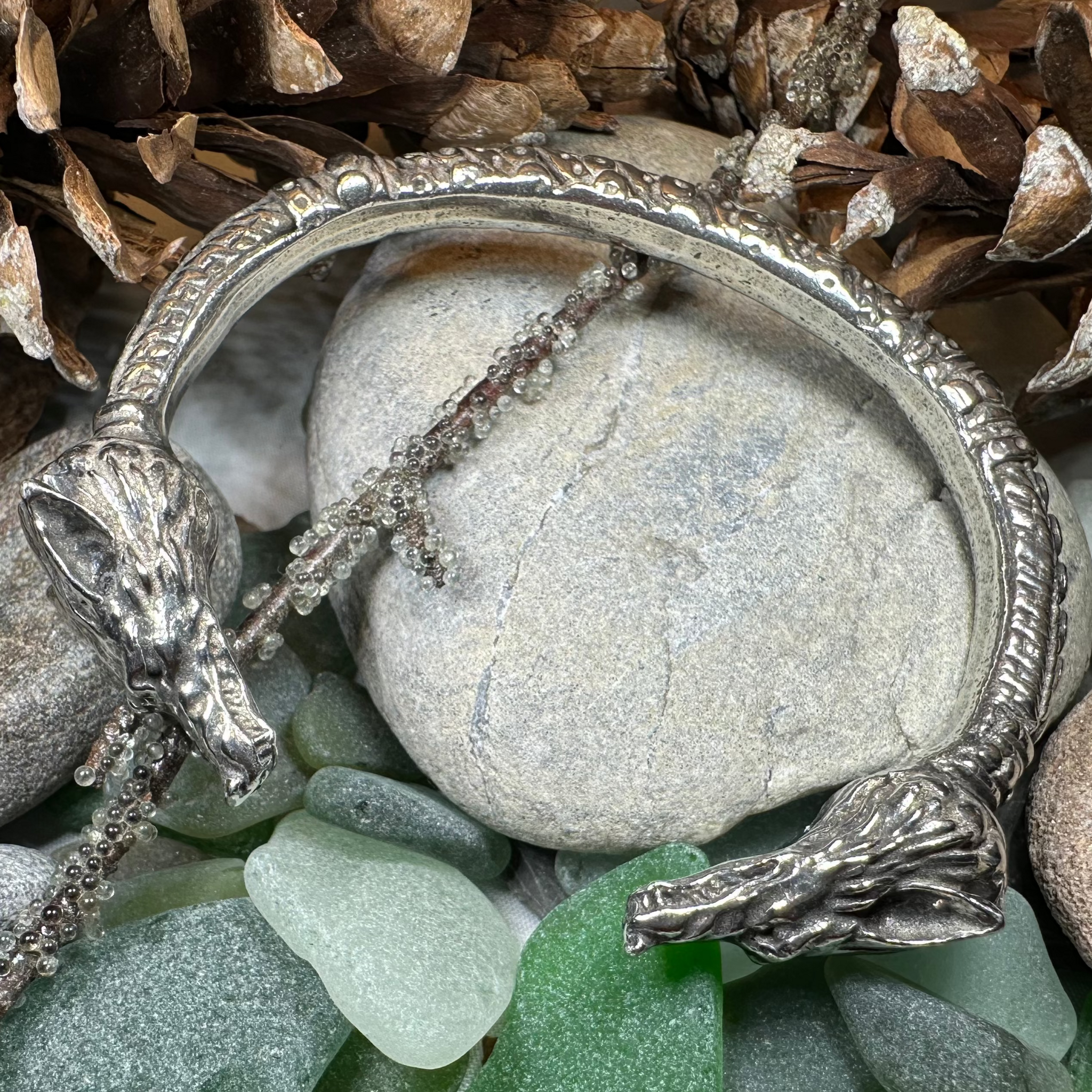 Stunning! Our lead & nickel free Pewter Celtic Wolf Bangle Bracelet features an ancient Celtic weave design that goes back thousands of years, embraced on both sides by a detailed wolf head.