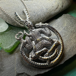 Large Solid Sterling Silver Cerunnons, the Horned God, Pendant with chain.