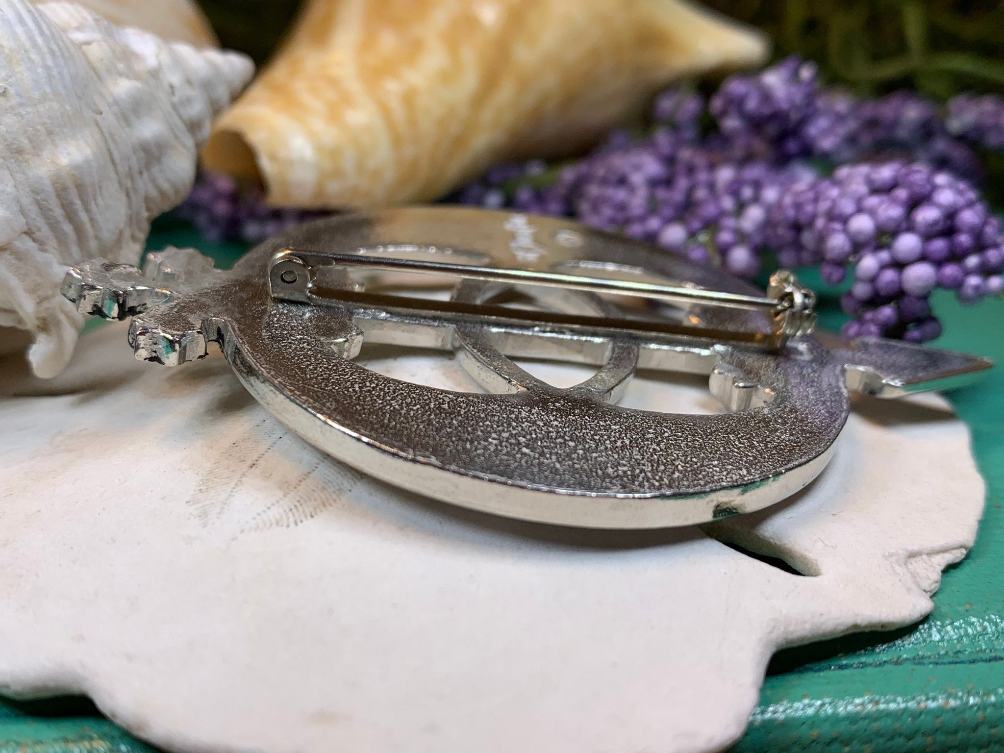 Meticulously crafted from solid pewter. 2 3/4" x 1 3/4" brooch with a locking steel pin.