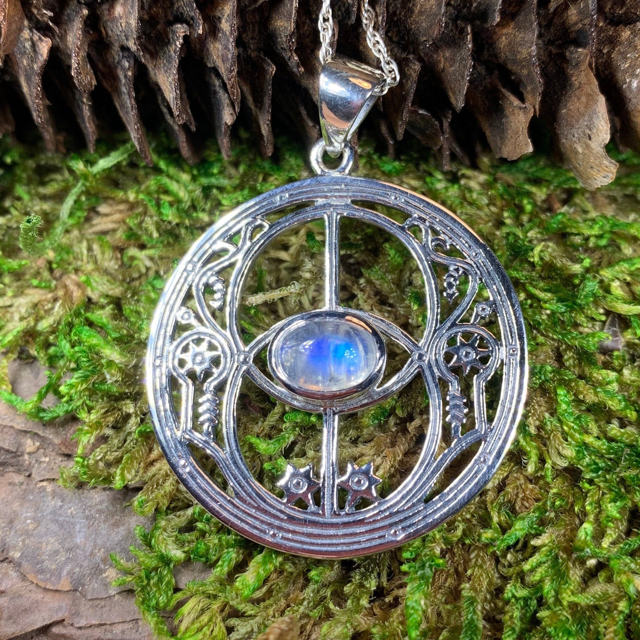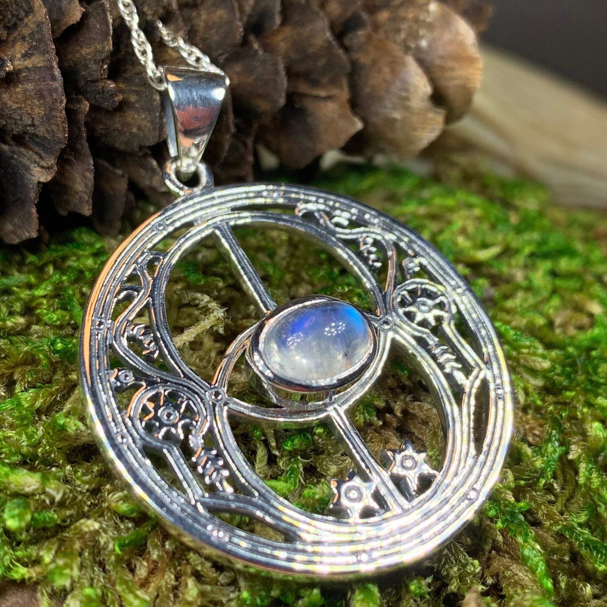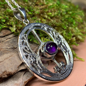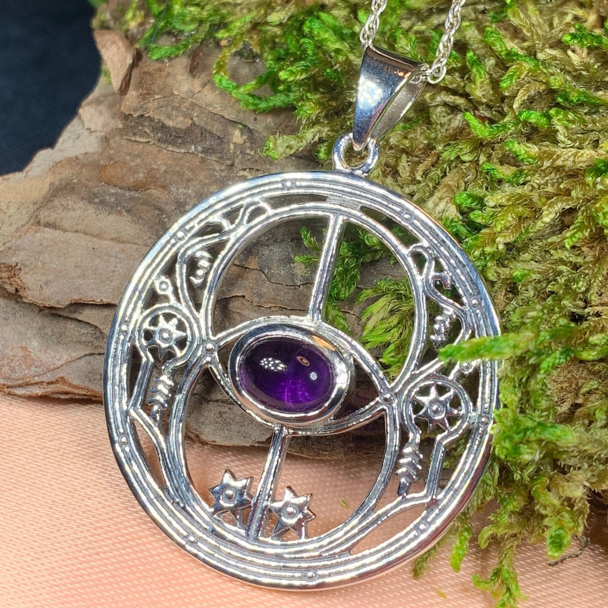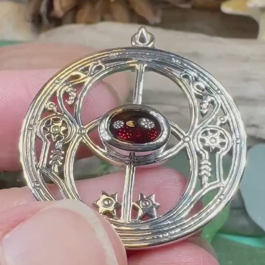 This sophisticated Isobel necklace showcases the Chalice Well symbol, steeped in rich mythology. The design features the Vesica Piscis—two interlocking circles divided by a sword reminiscent of Excalibur. Associated with both the Holy Grail legend and divine feminine energy, it embodies the mystical gateway between worlds celebrated in ancient Celtic traditions.