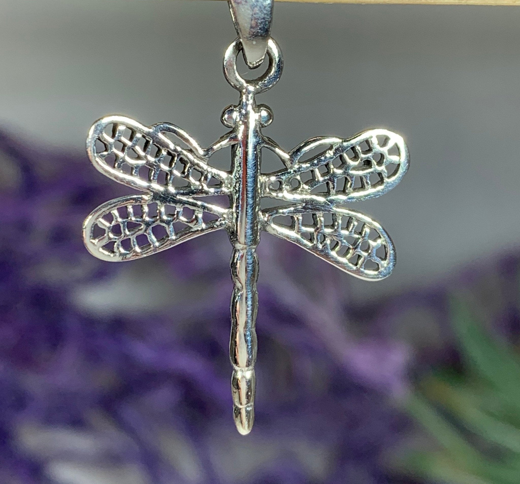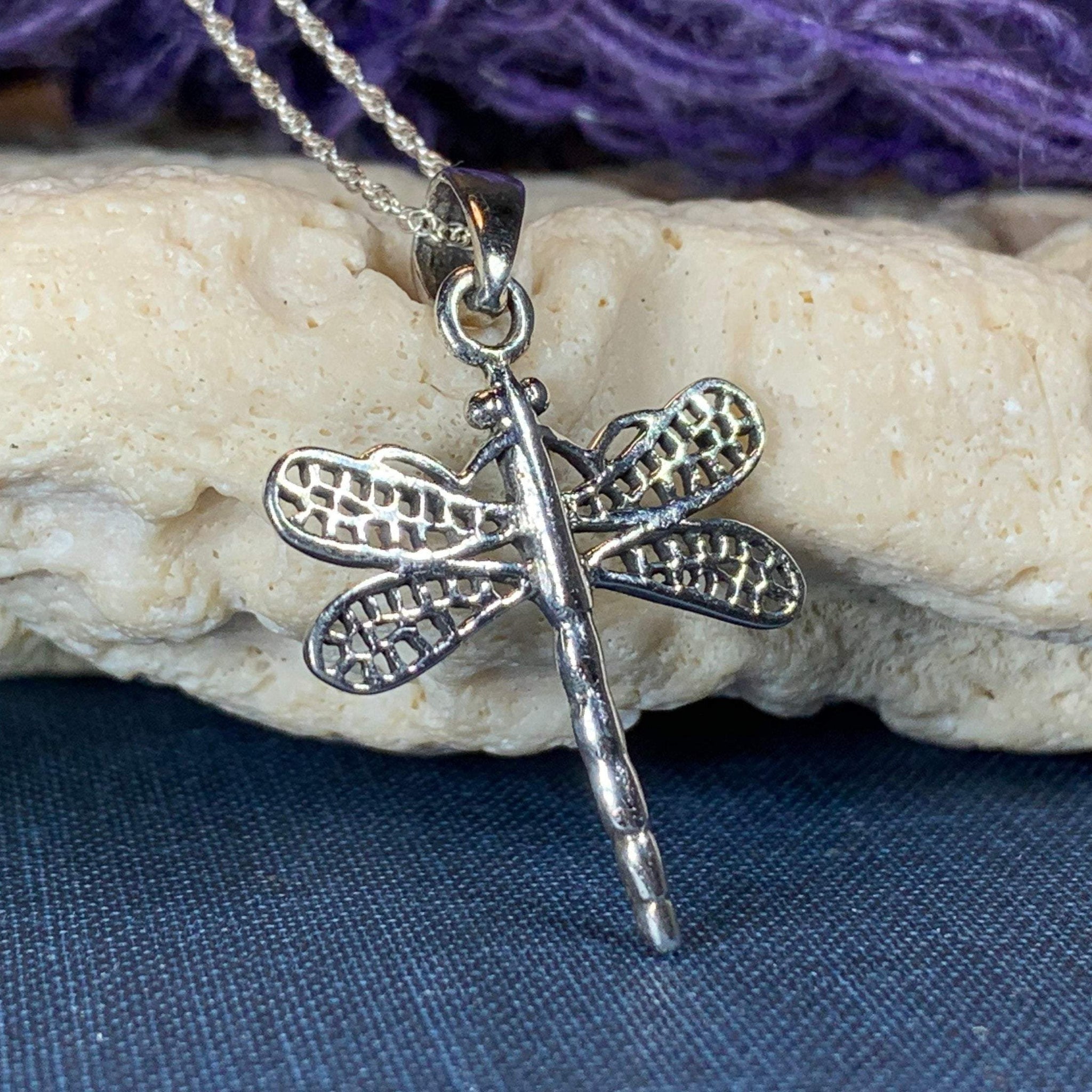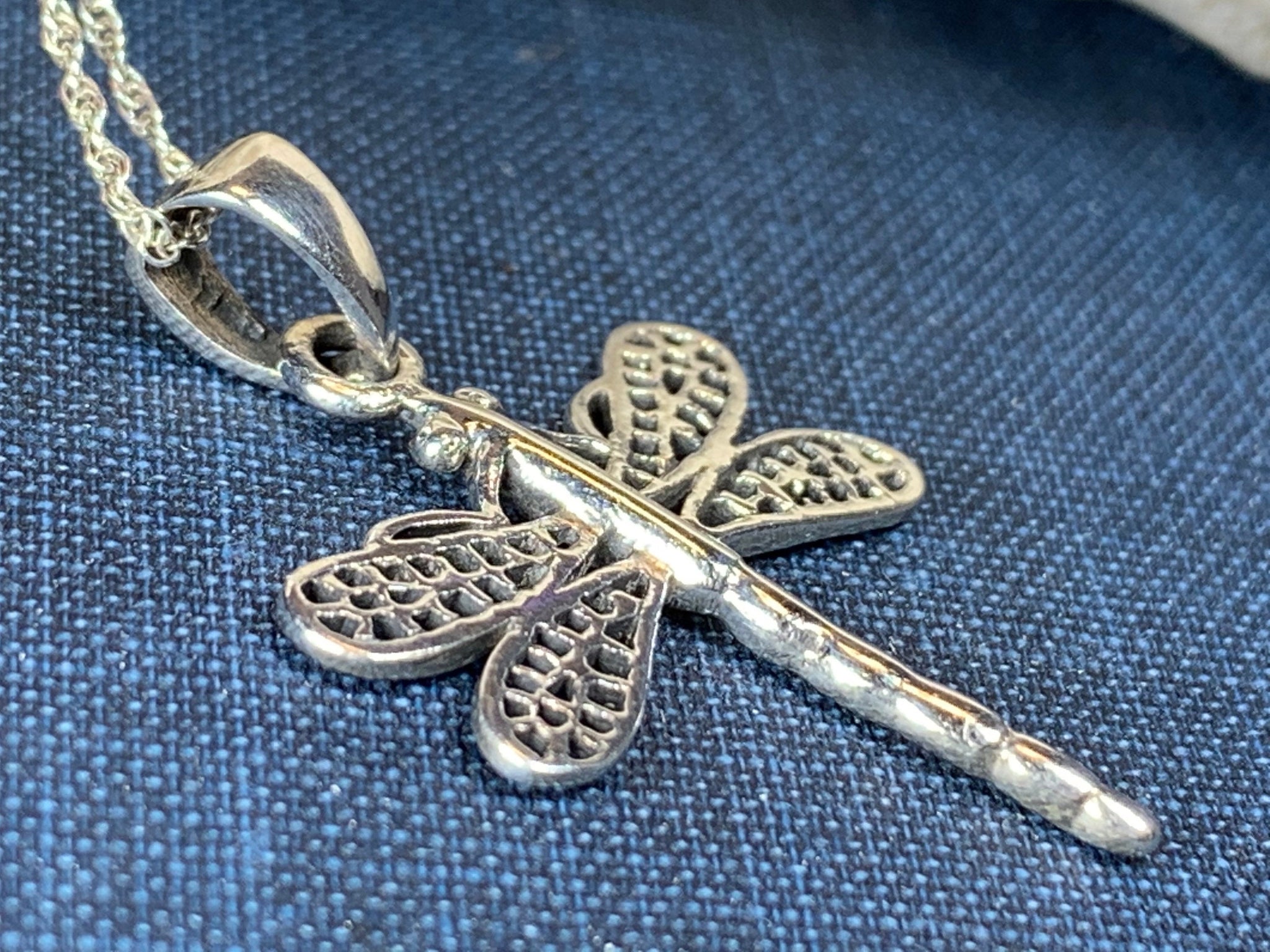 A cheerful dragonfly (3/4" x 3/4") in solid sterling silver on a sterling silver chain.