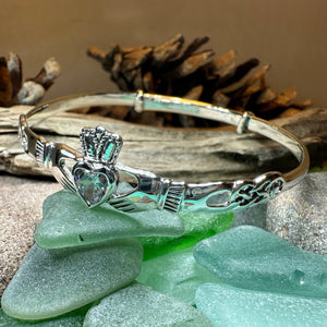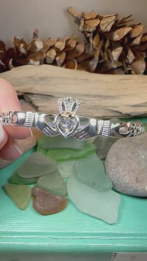 Solid Sterling Silver Claddagh Bangle Bracelet with heart shaped diamond zirconia gemstone.