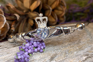 Stunning! Our highly polished solid sterling silver Claddagh Bangle Bracelet features the 17th century Claddagh design, embraced on both sides by smooth, highly polished sterling silver.