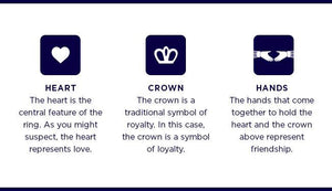 The origins of the symbol came from a humble Galway fishing village, but it is now one of the most recognizable symbols in the world. The Claddagh meaning is all about love, loyalty, and friendship. The two hands represent friendship, a heart symbolizes love and the crown on top is for loyalty. Let's take a closer look at this traditional Irish symbol: