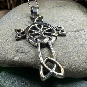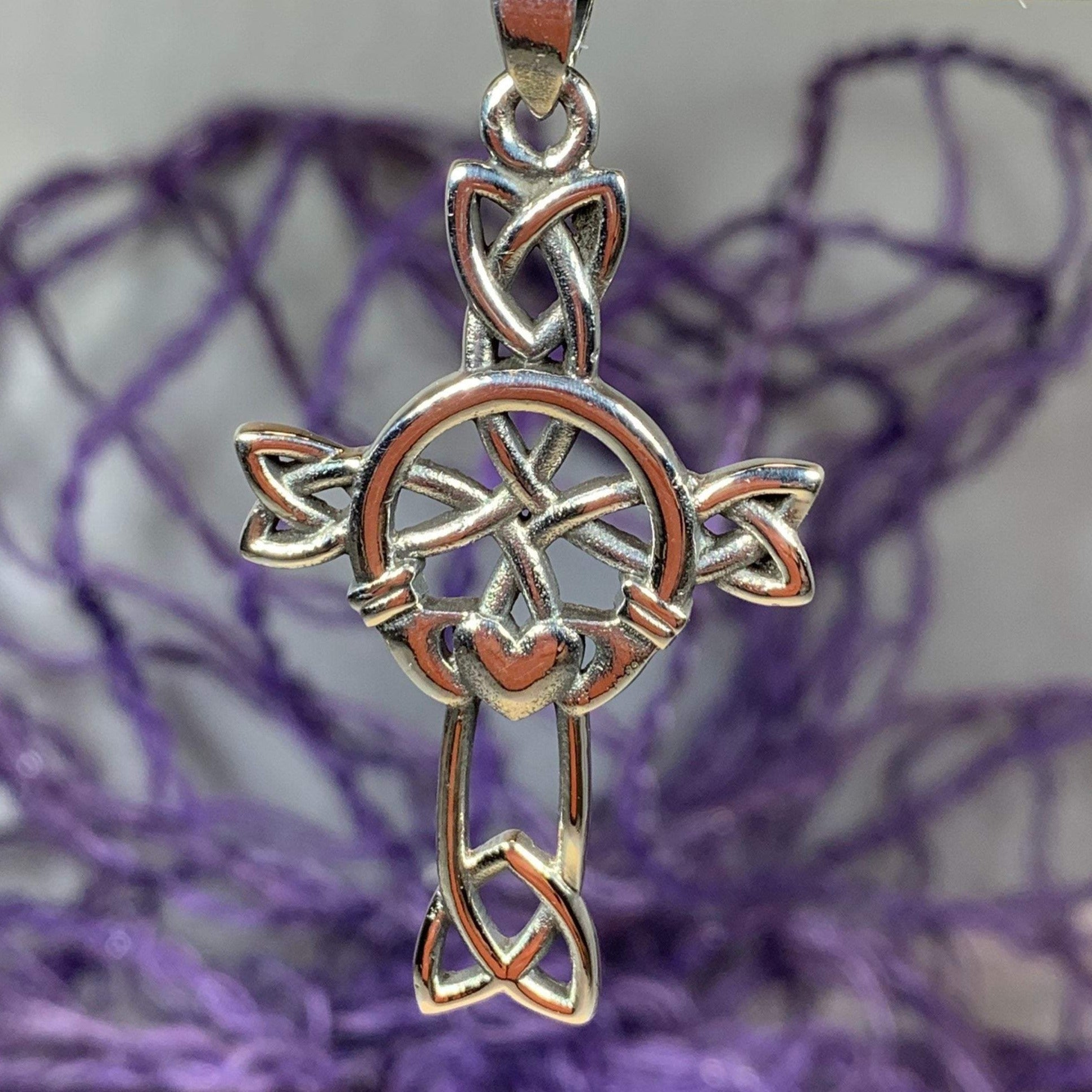 This stunning pendant combines two traditional Irish symbols, the Claddagh and the Celtic cross, making a beautiful gift.
