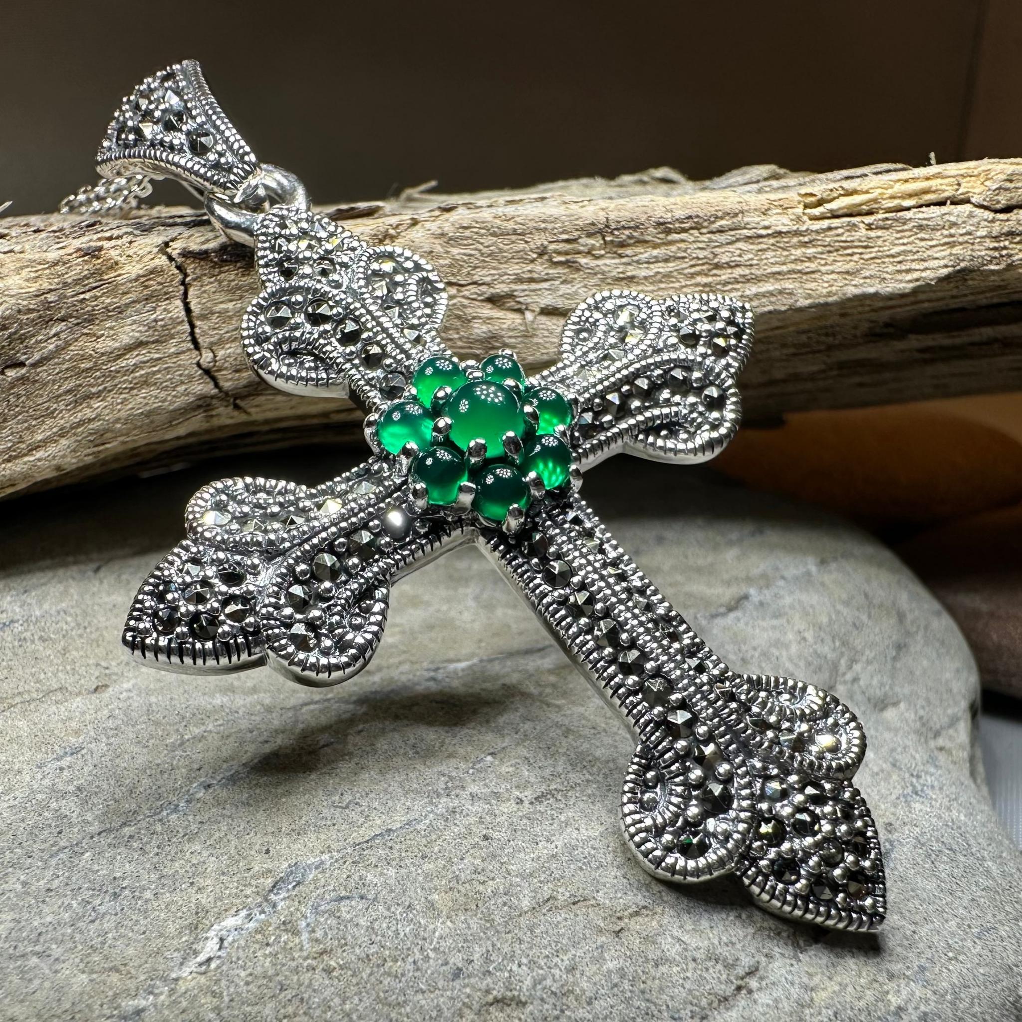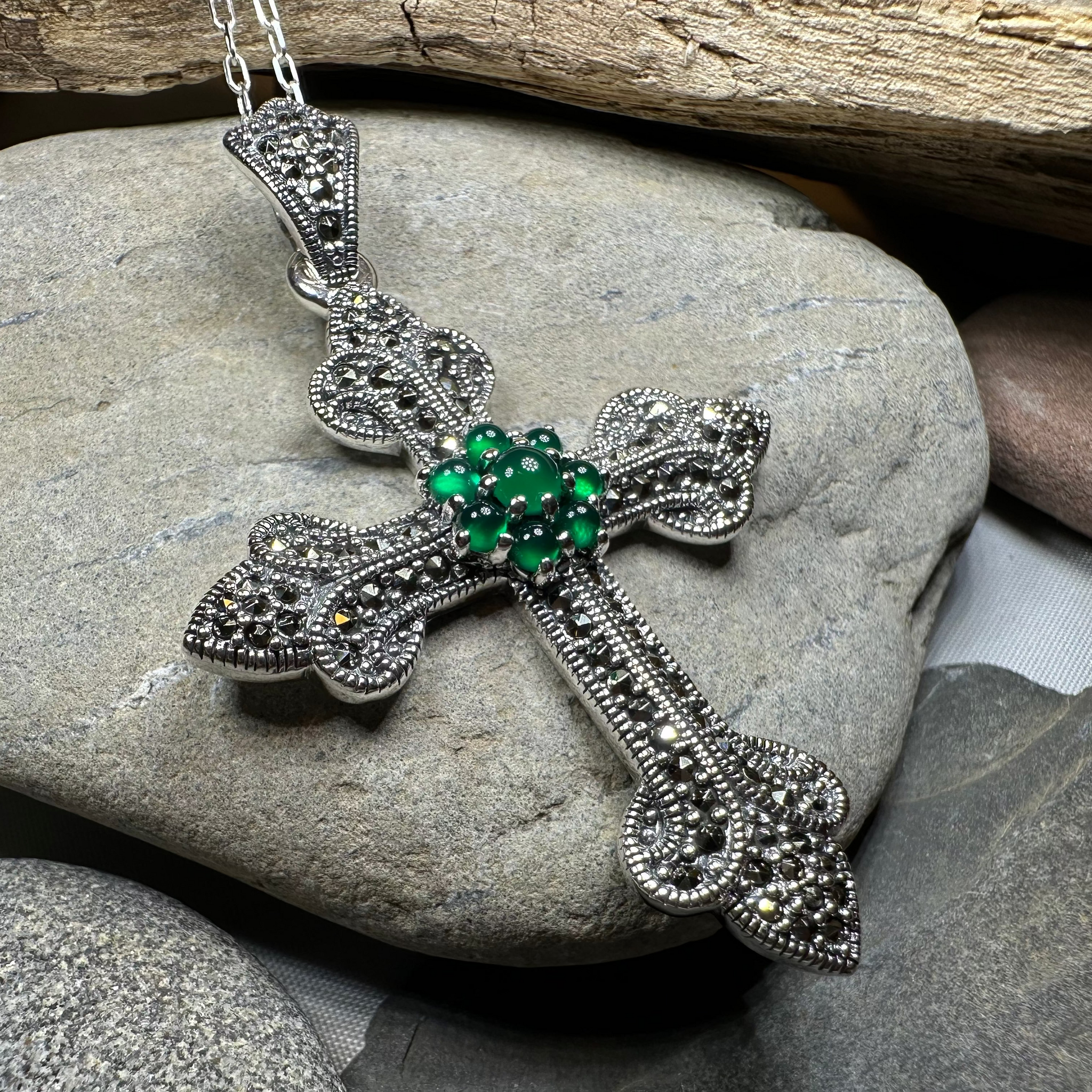 A lovely Celtic cross inspired by medieval crosses. Adorned with sparkling marcasite gemstones and eight glowing green agates - this is a piece that will stand out. Handmade in solid sterling silver, this large cross is hallmarked 925.