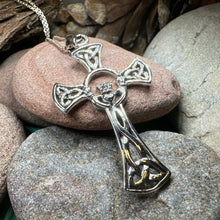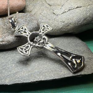 This stunning pendant combines two traditional Irish symbols, the Claddagh and the Celtic cross, making a beautiful gift.