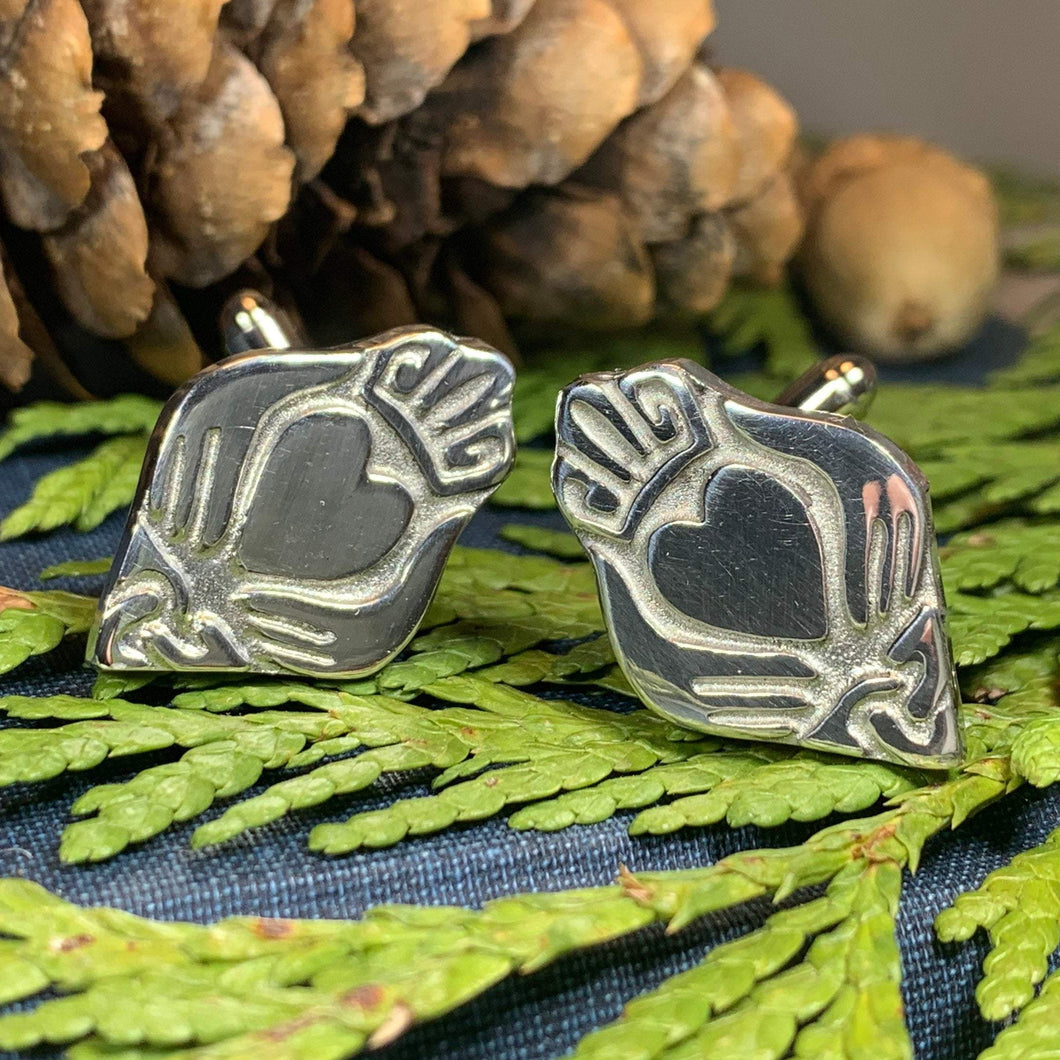 Show your Irish pride and deep love with these elegant Claddagh cuff links with a trinity knot. Beautifully detailed and made of polished lead free pewter.
