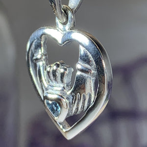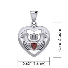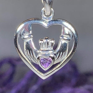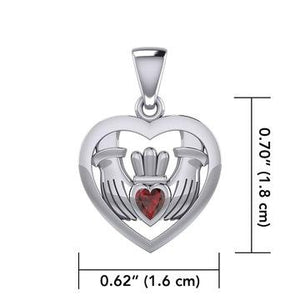 The heart of the Claddagh is accented with a lovely authentic gemstone of your choice: amethyst, garnet or blue topaz.