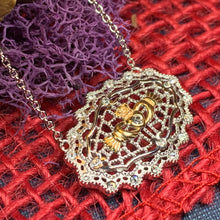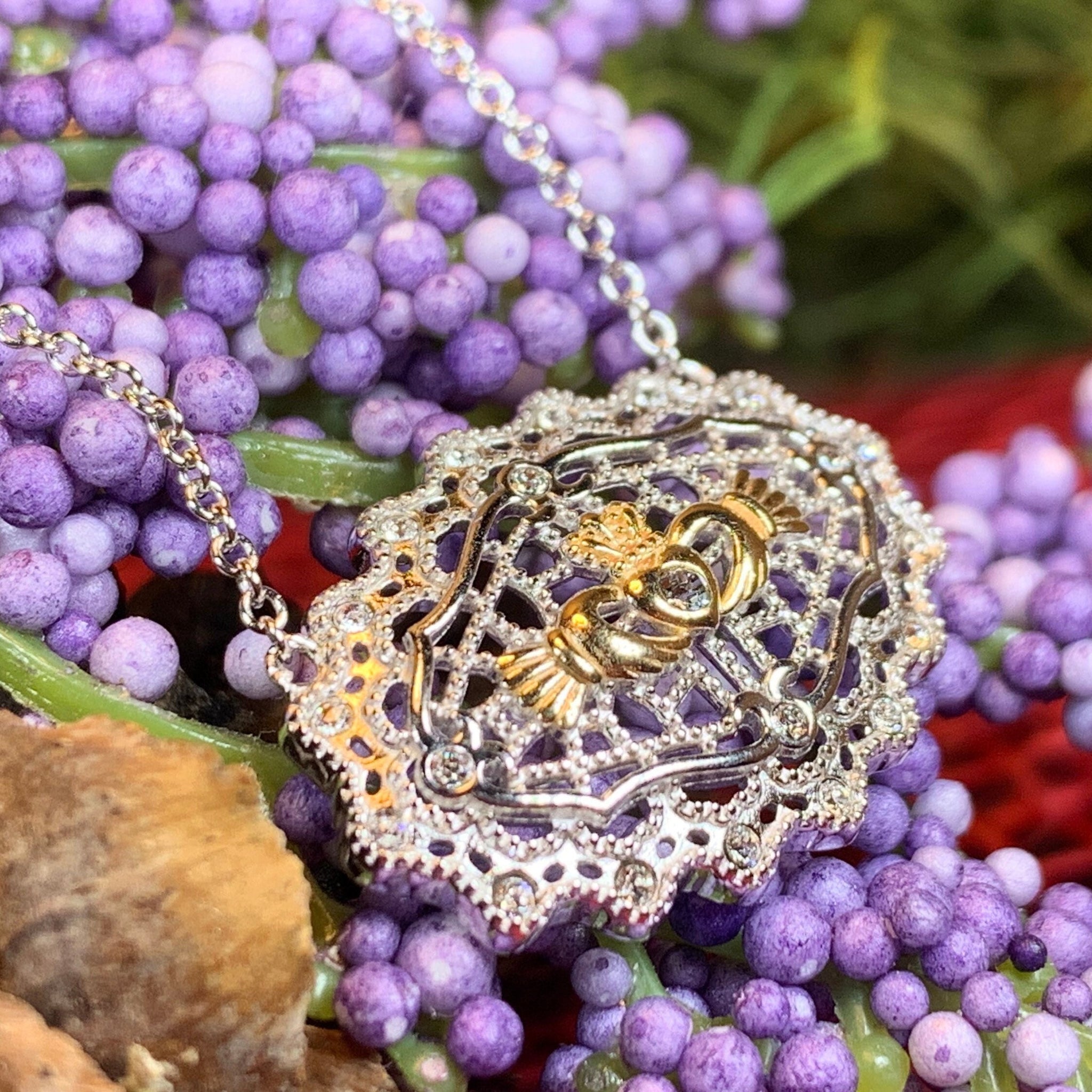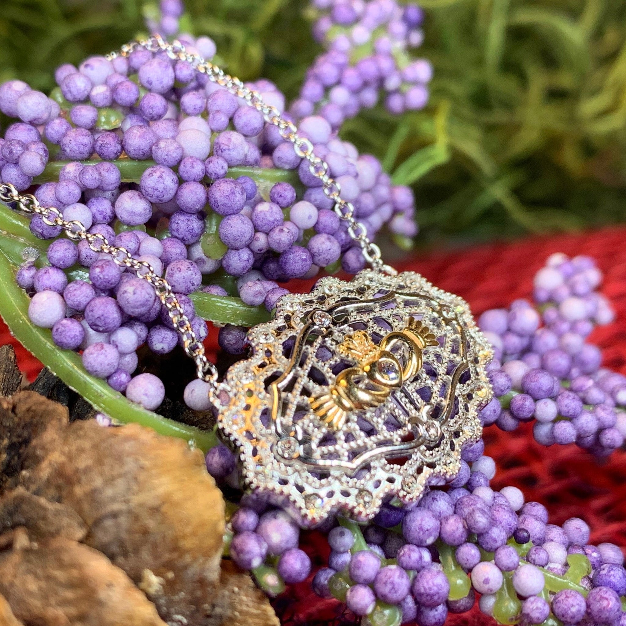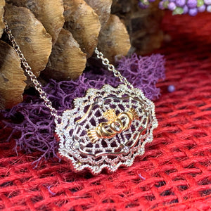 The 14k gold claddagh center makes this piece a perfect gift for a loved one on her wedding day, anniversary or any special occasion that calls for something a little extra special. Set into the outer edges of the lace is 15 tiny diamond cubic zirconias adding a little classy sparkle to this unique pendant.