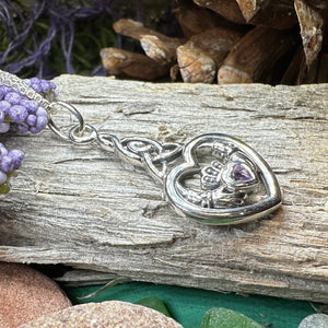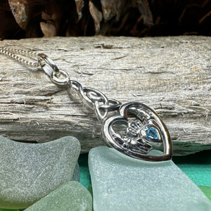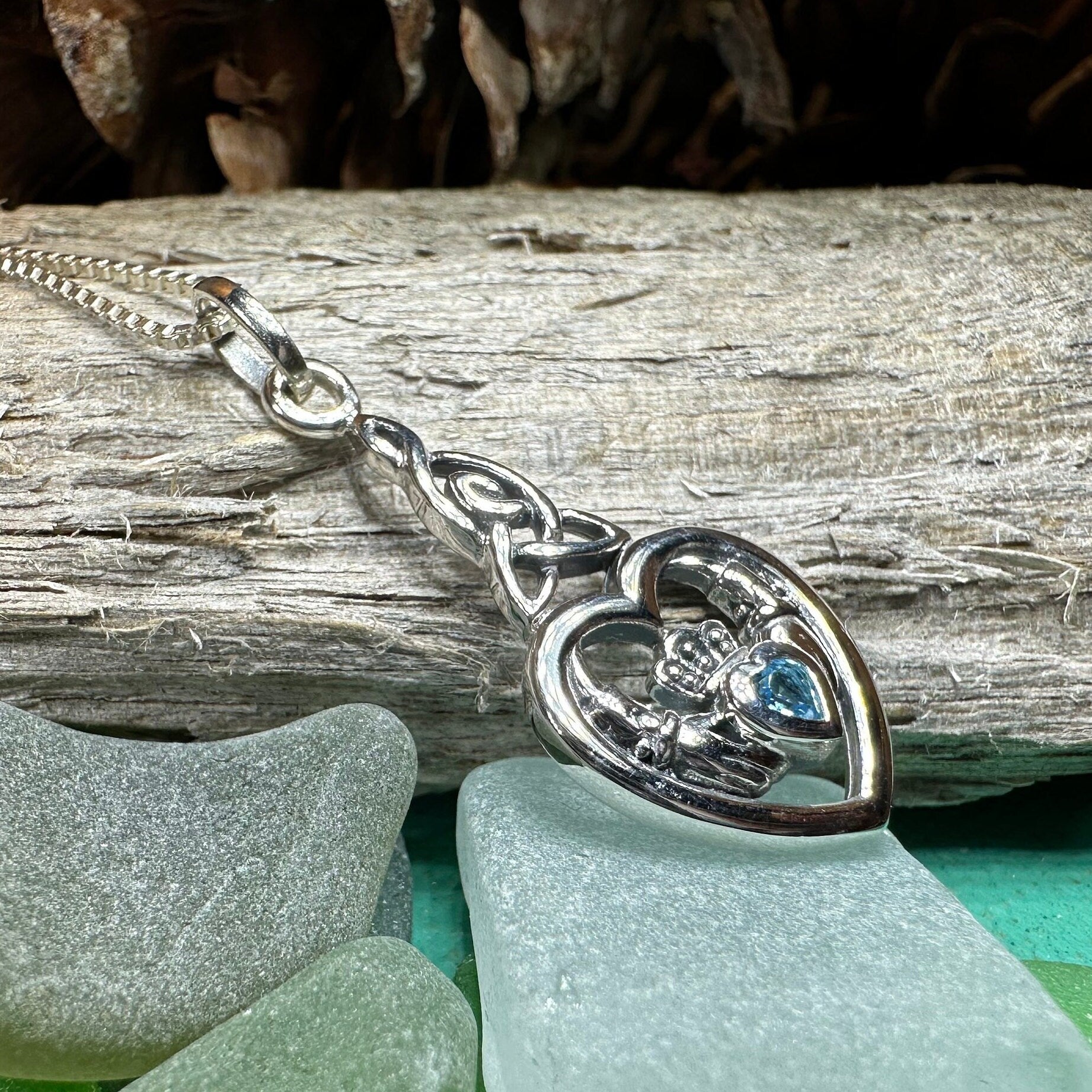 Solid Sterling Silver Claddagh necklace with heart shaped gemstone of your choice