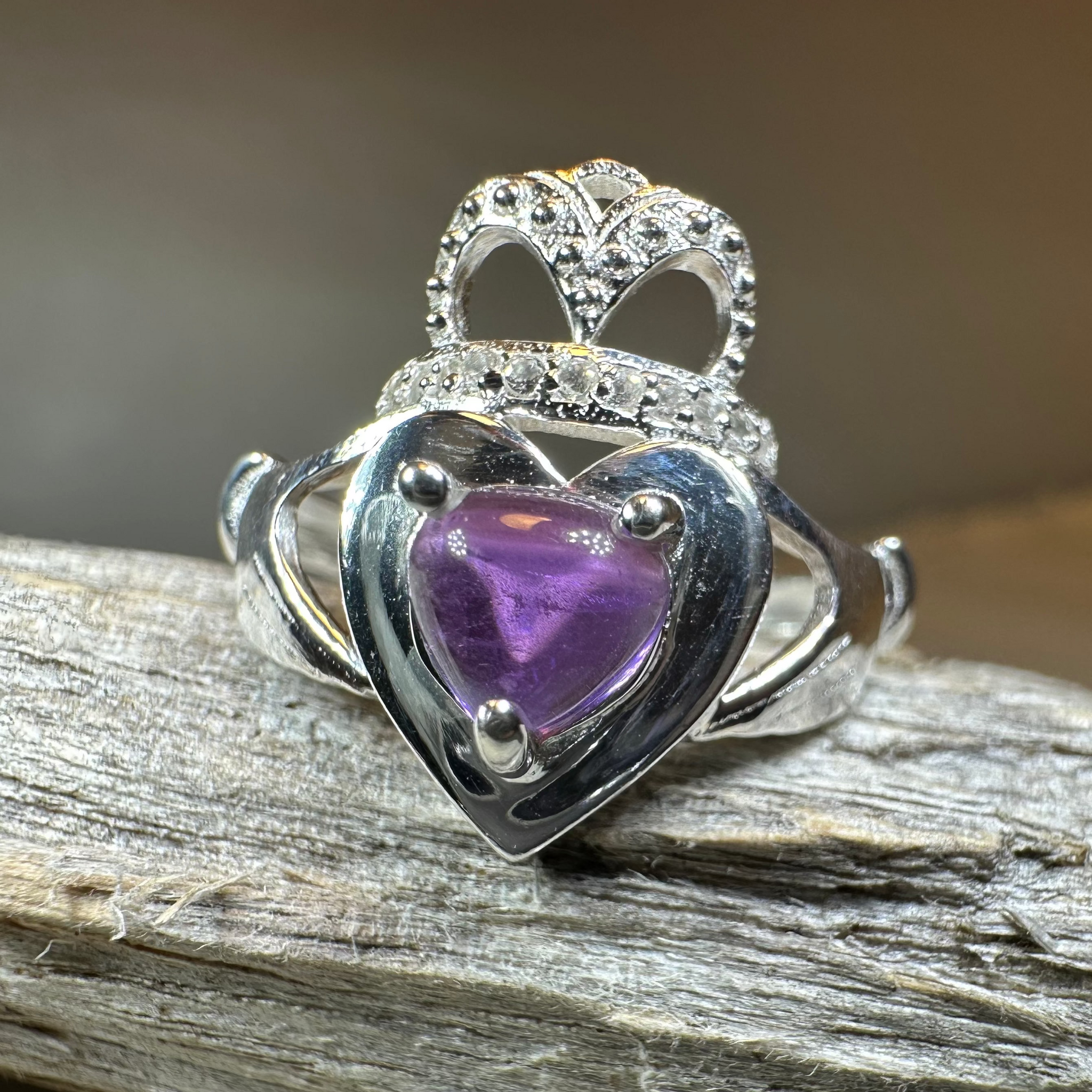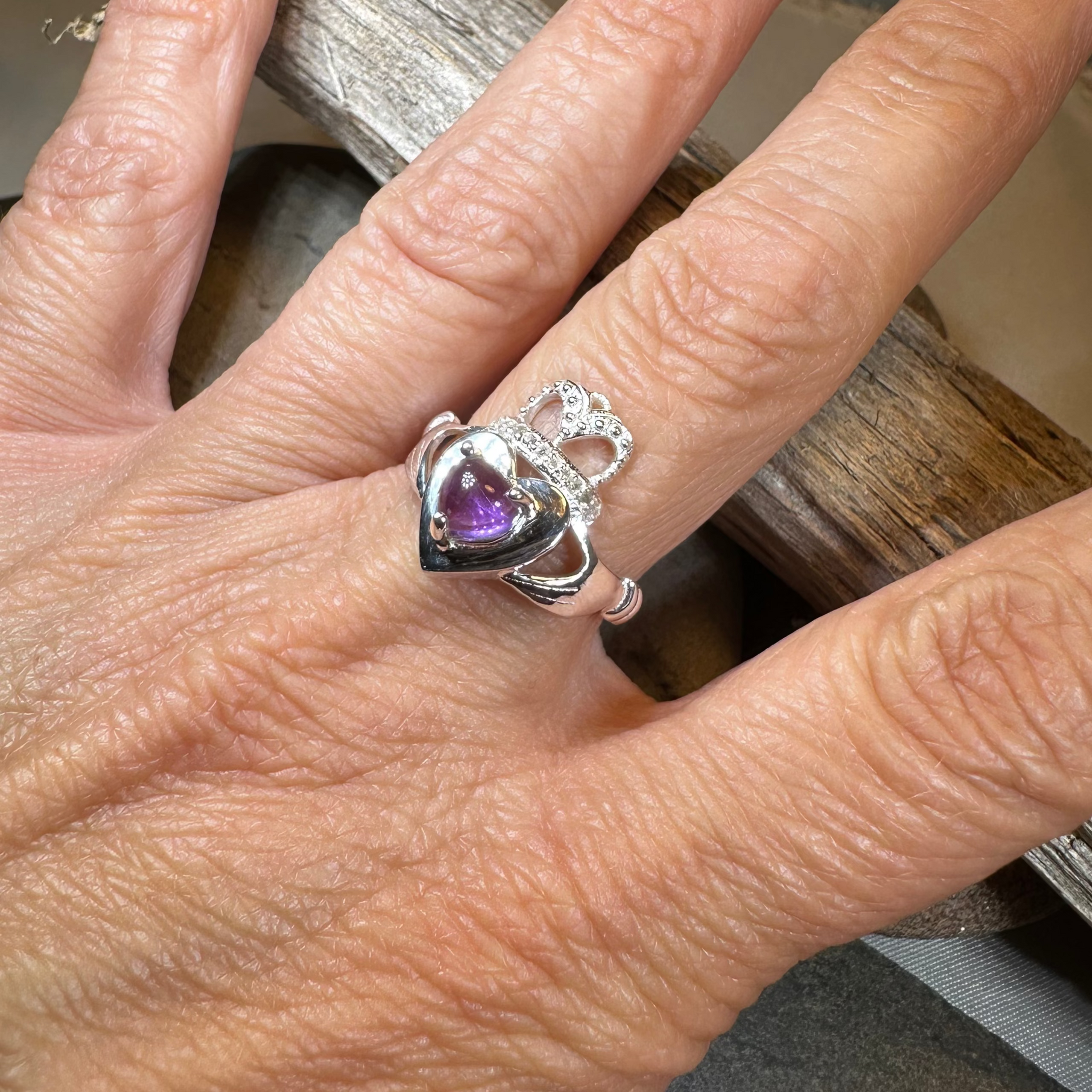 A unique design combining the traditional elements of the Claddagh with a one carat cabochon amethyst stone - solid sterling silver. This beautiful claddagh ring features an elaborate open work crown with an amethyst stone that glows in a beautiful purple color.