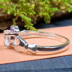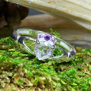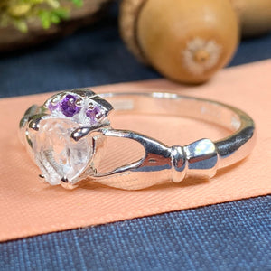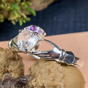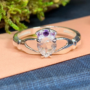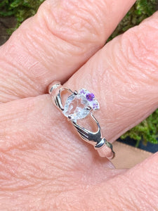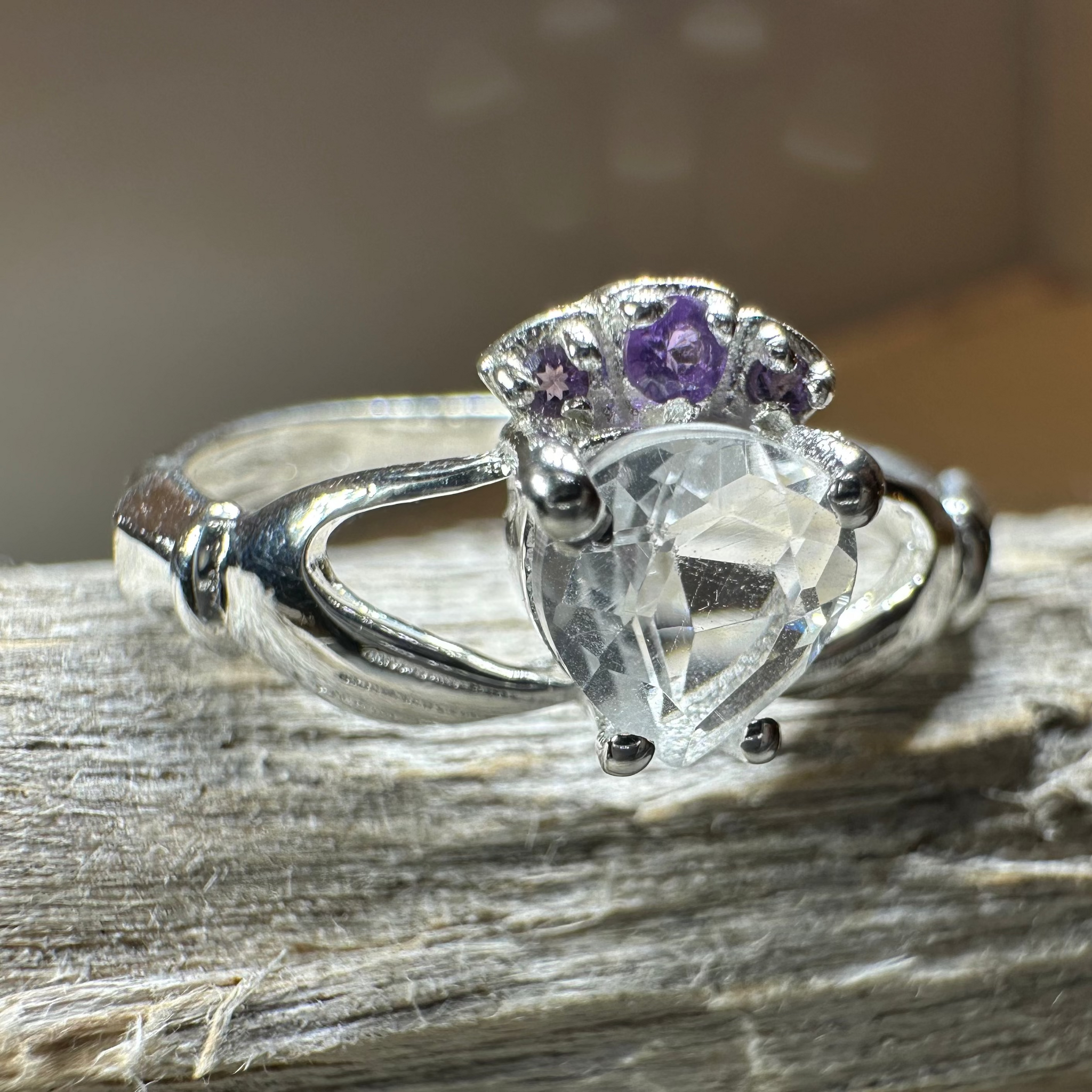 A unique design combining the traditional elements of the Claddagh with a beautiful faceted white topaz stone - solid sterling silver. This beautiful claddagh ring features a white topaz heart and three amethyst stones in the crown! A unique and elegant Claddagh for you or a loved one!