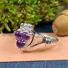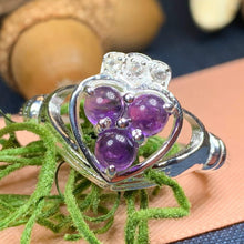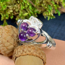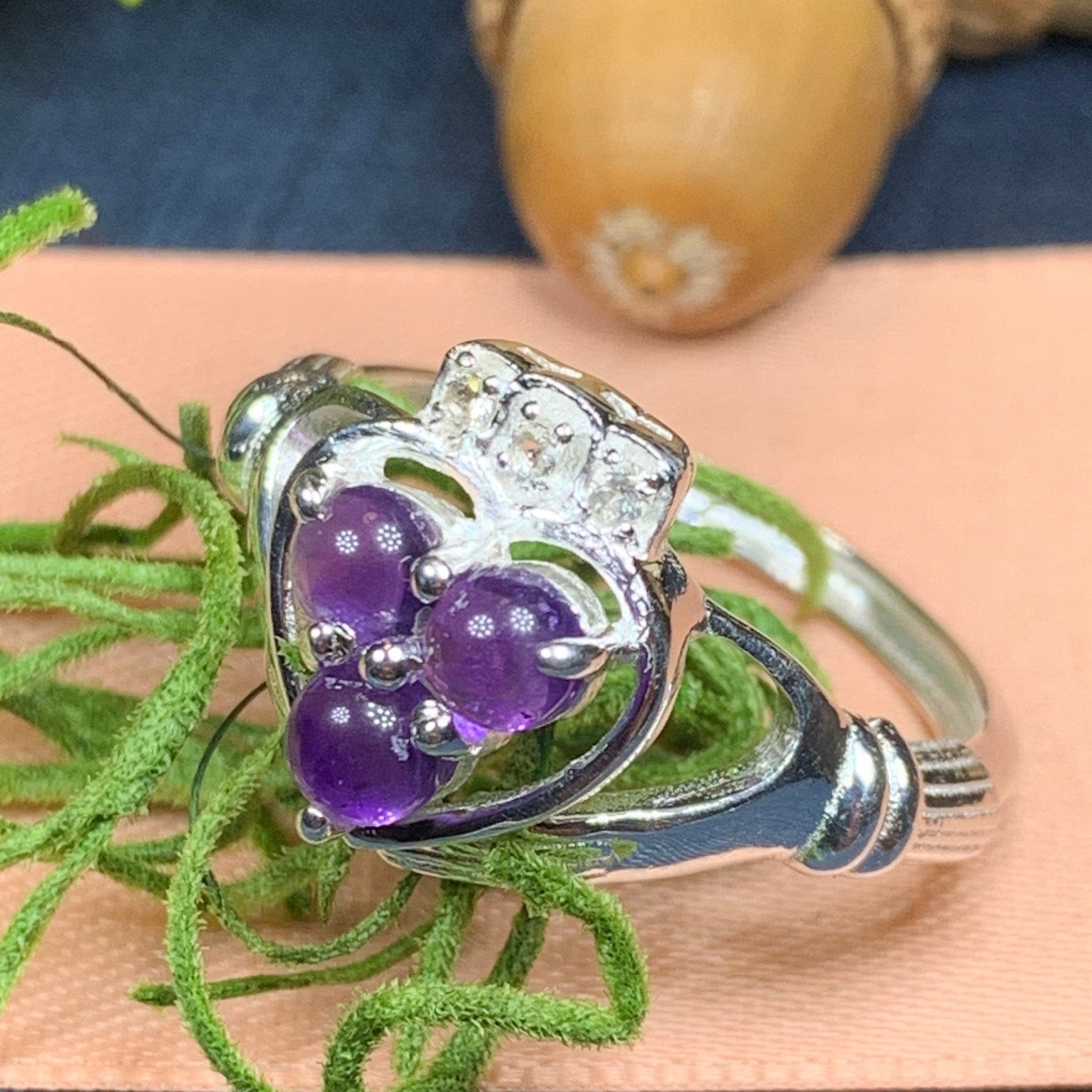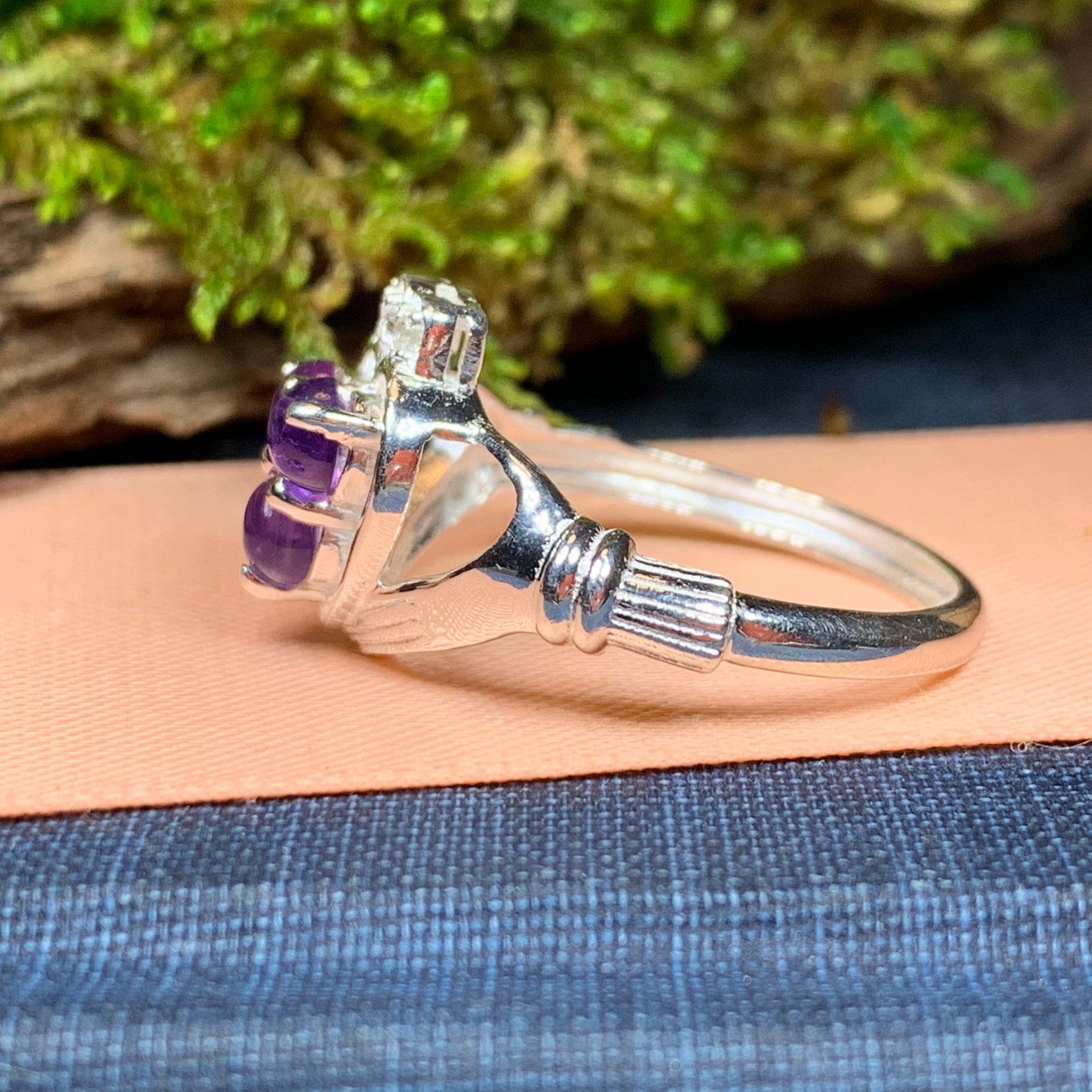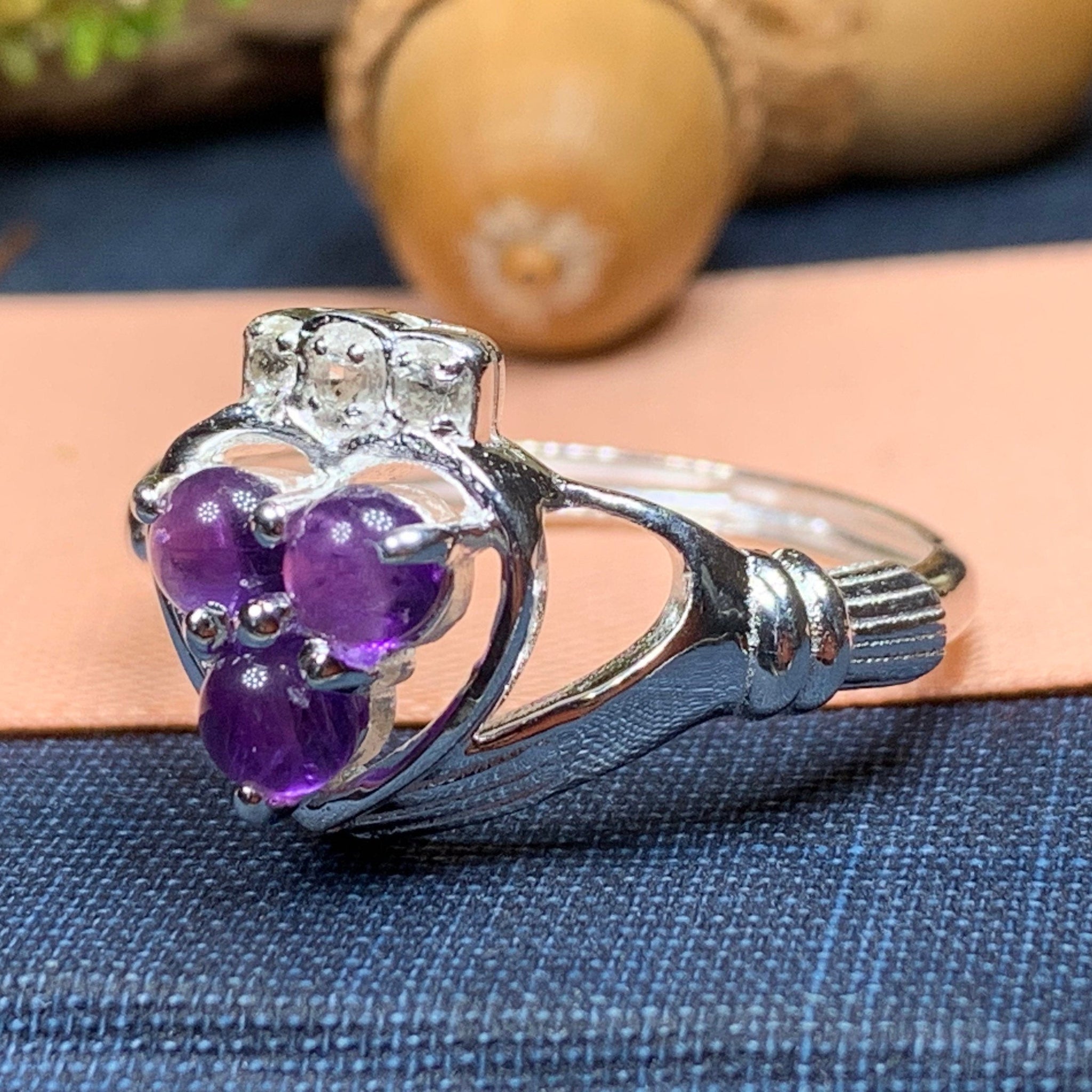 A unique design combining the traditional elements of the Claddagh with three deep purple amethyst stones - solid sterling silver.