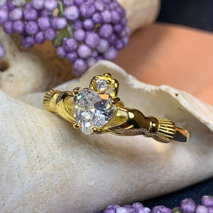 A unique design combining the traditional elements of the claddagh with celtic knot work - solid sterling silver plated with 18K yellow gold with a heart shaped cubic zirconia. This gorgeous stone shines and catches every light!