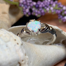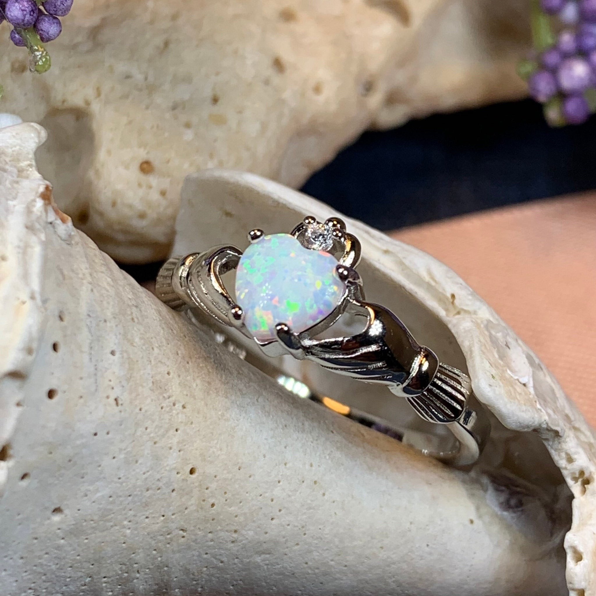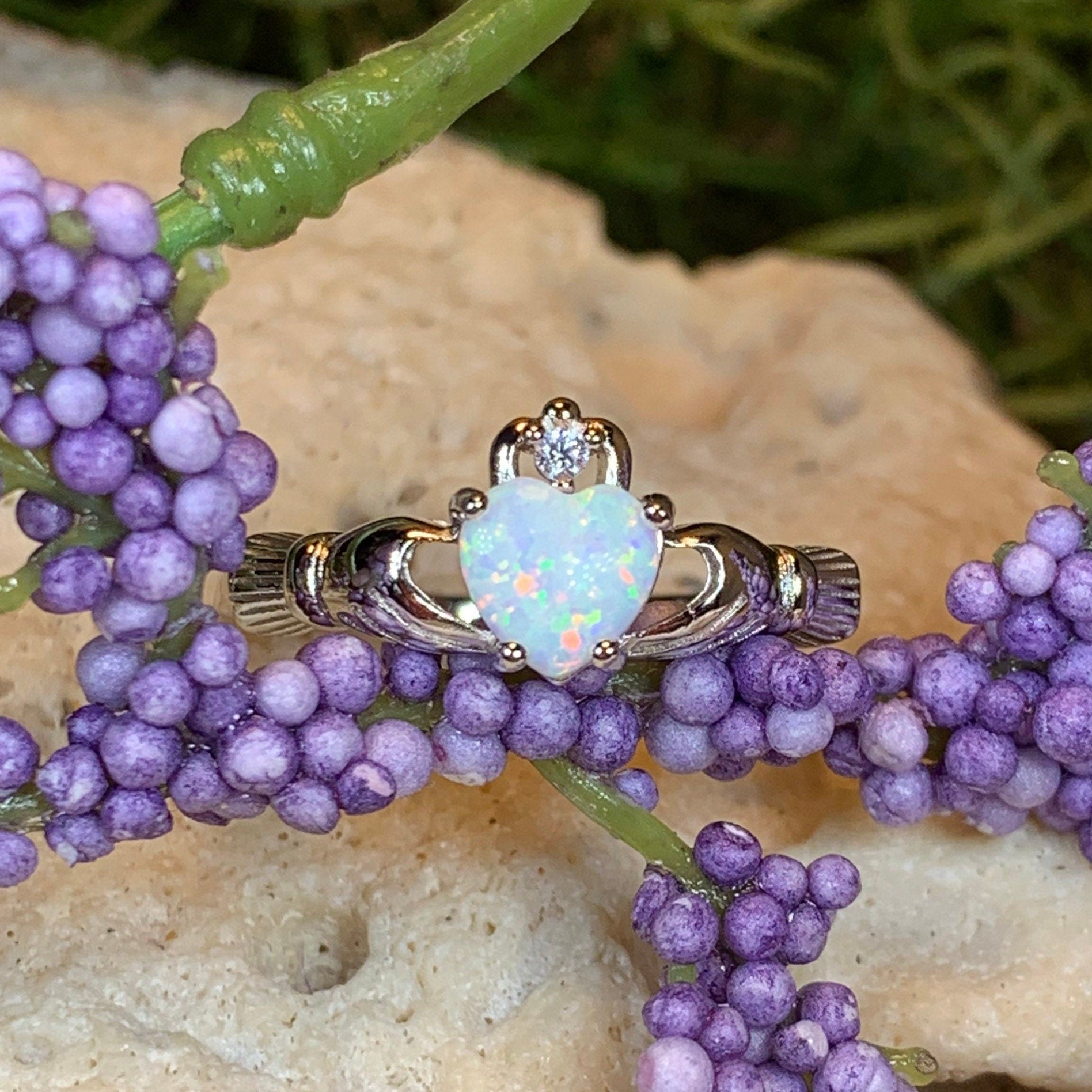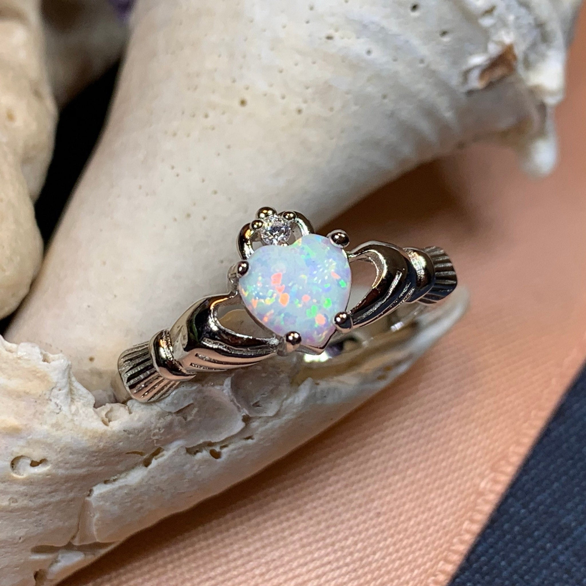 A unique design combining the traditional elements of the claddagh with celtic knot work - solid sterling silver with a heart shaped lab-created white opal. This gorgeous stone shines in several shades of an amazing apricot, pink, green and gold colors!