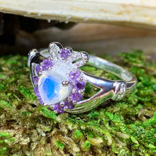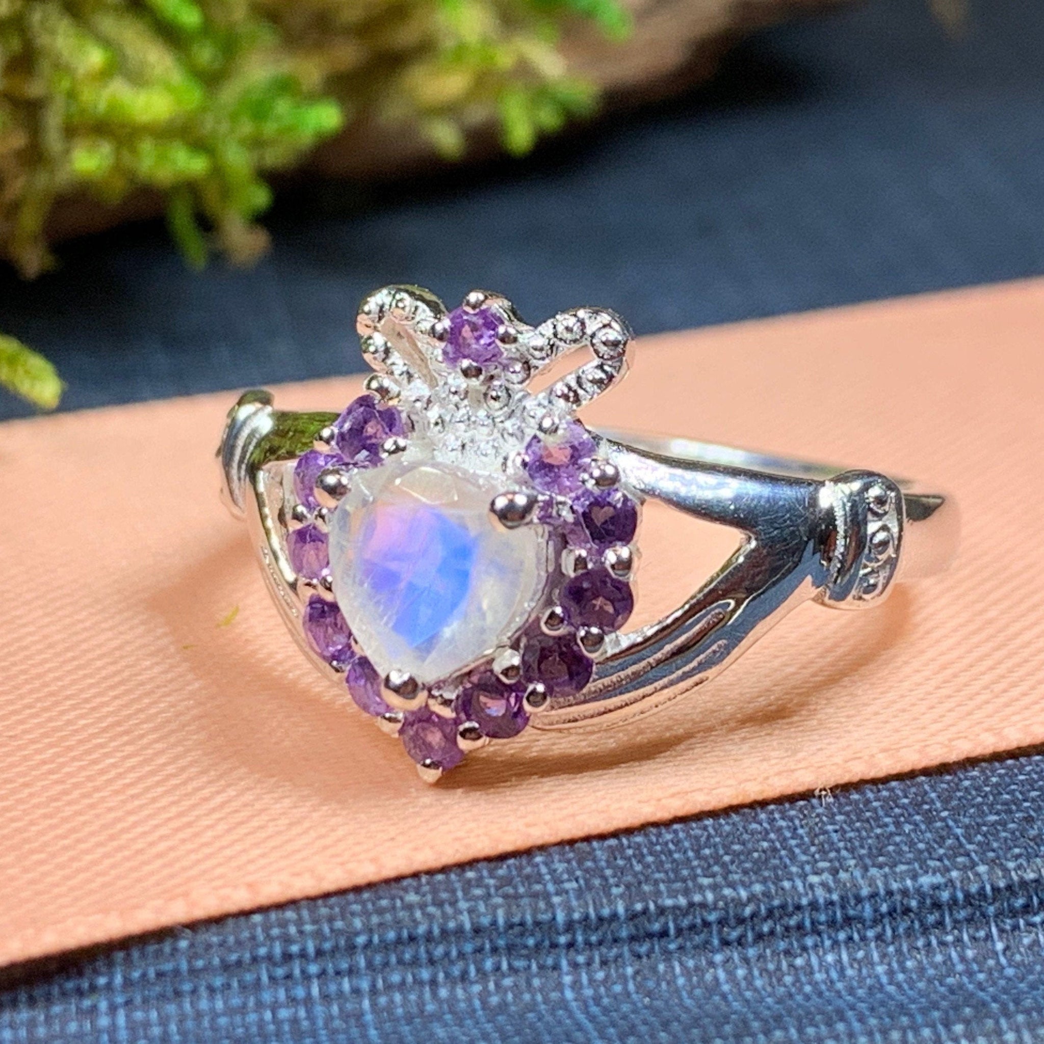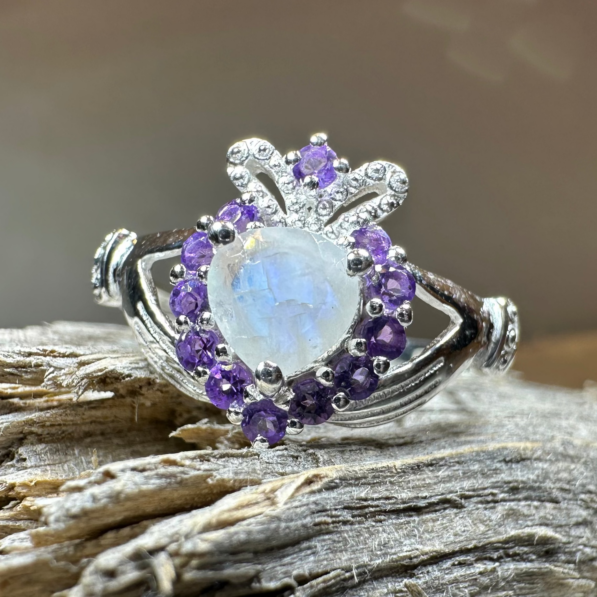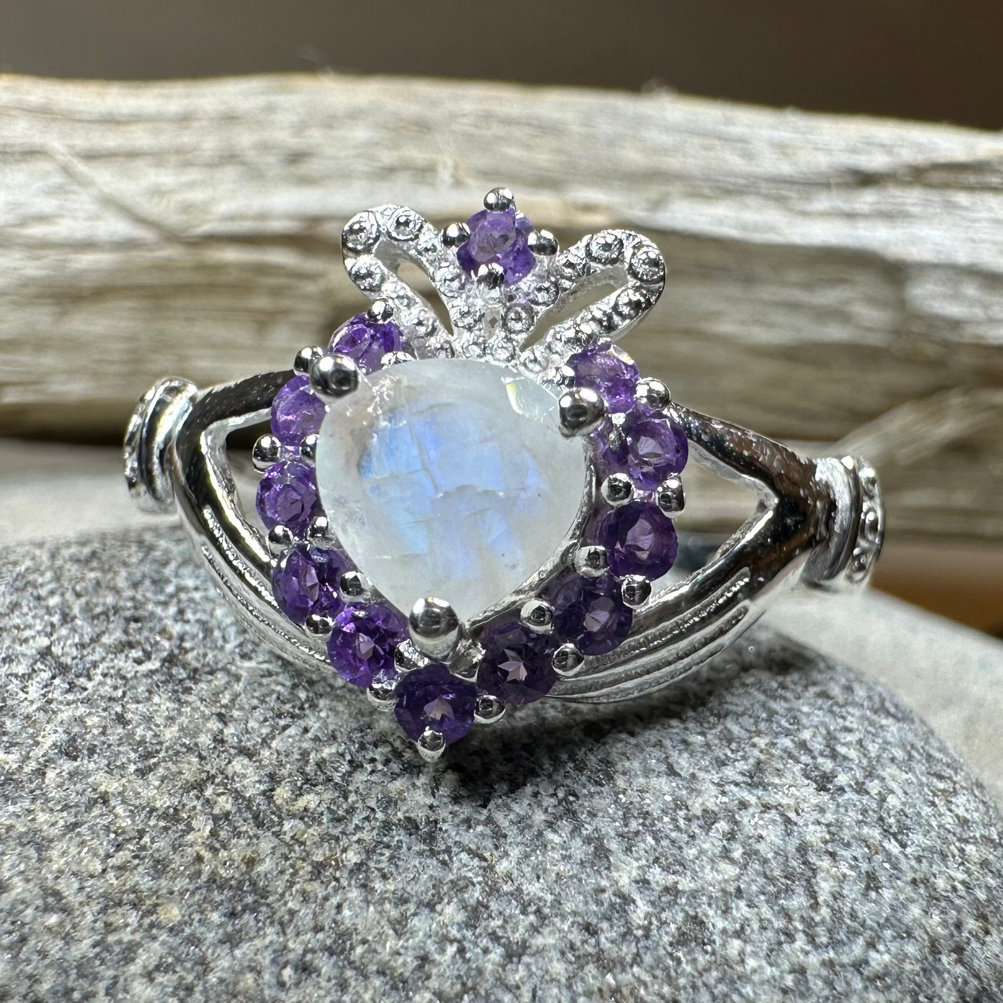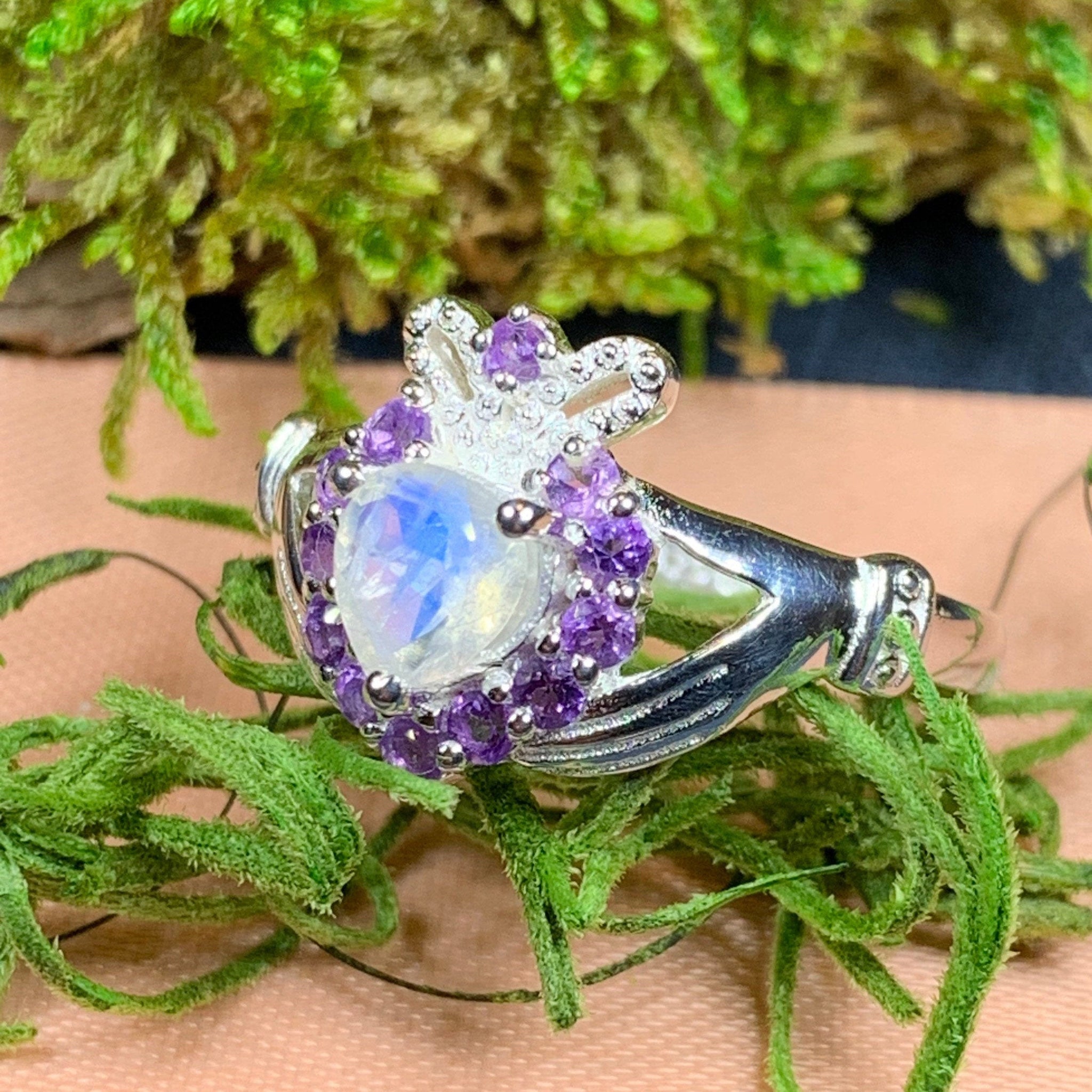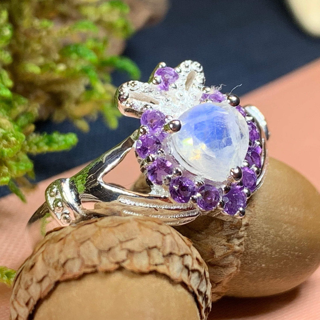 A unique design combining the traditional elements of the Claddagh with a beautiful faceted rainbow moonstone heart - solid sterling silver. This beautiful claddagh ring features a rainbow moonstone heart surronded by faceted amethyst stones and a beautifully detailed crown! A unique and elegant Claddagh for you or a loved one!