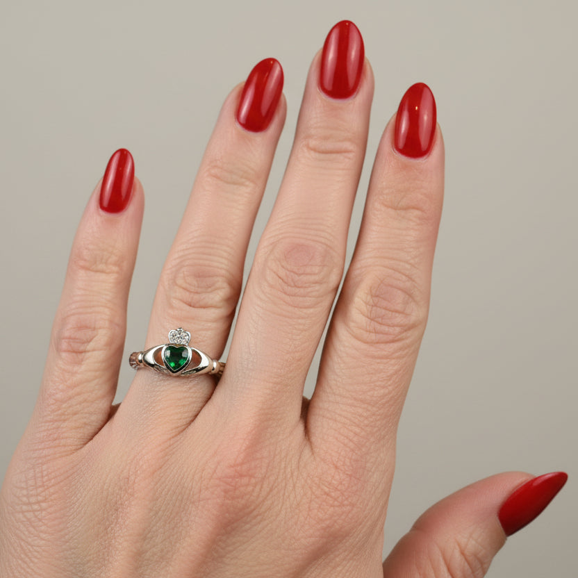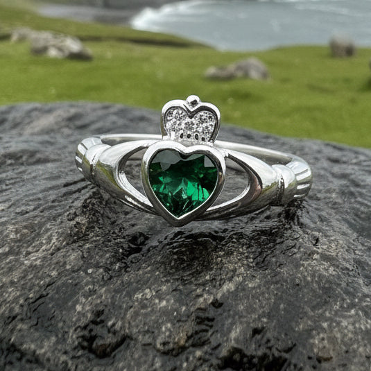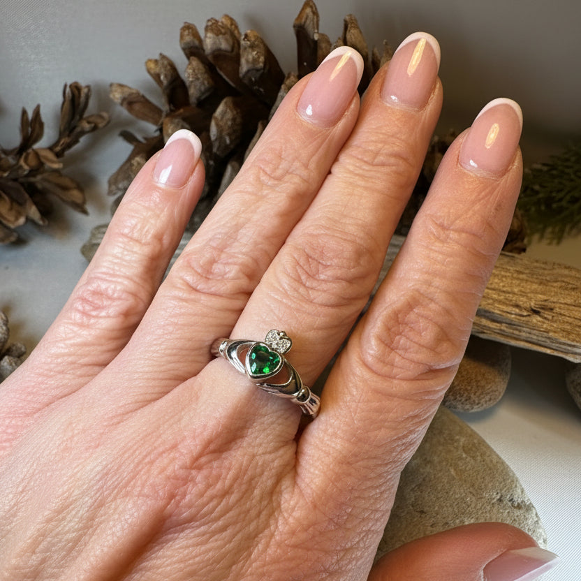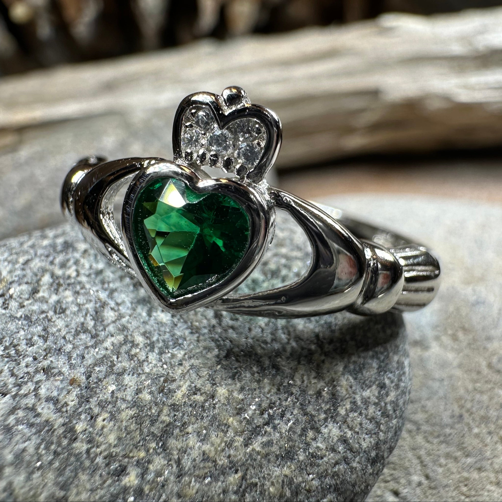 A unique design combining the traditional elements of the claddagh with celtic knot work - sterling silver with a heart shaped emerald cubic zirconia two diamond zirconia stones set in the crown.