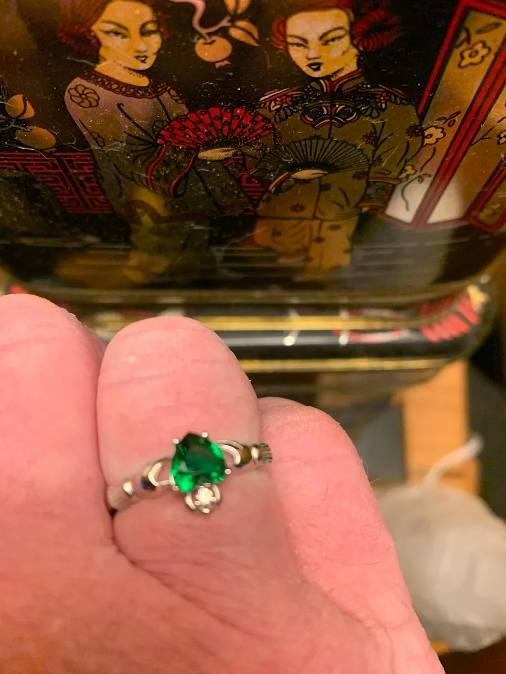 A unique design combining the traditional elements of the claddagh with Celtic knot work - sterling silver with a heart shaped lab-created emerald.