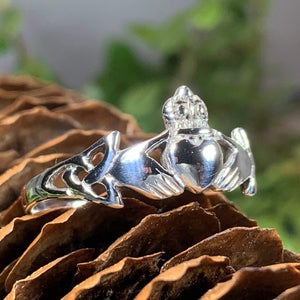 A unique design combining the traditional elements of the claddagh with Celtic knot work - solid sterling silver. This beautiful claddagh ring features trinity knots on the side of the heart and crown!