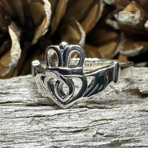 This beautiful piece expertly combines the timeless symbolism of the Claddagh with intricate Celtic knot work, all crafted in robust sterling silver and finished with a rhodium plating to ensure that it never fades. The thicker band design is built to withstand long-term wear.
