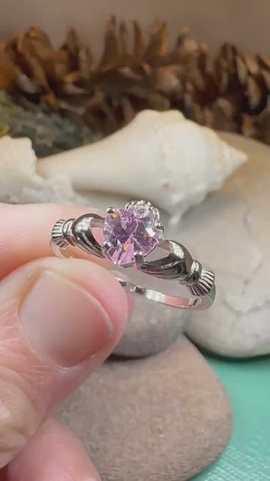 Pink Topaz CZ Claddagh ring set in solid sterling silver.