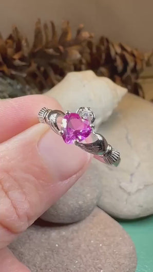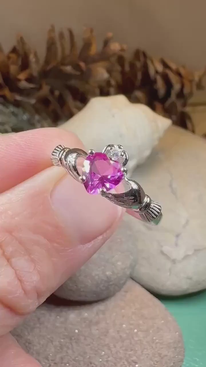 Rose Pink Topaz CZ Claddagh ring set in solid sterling silver.