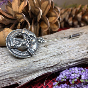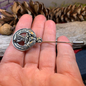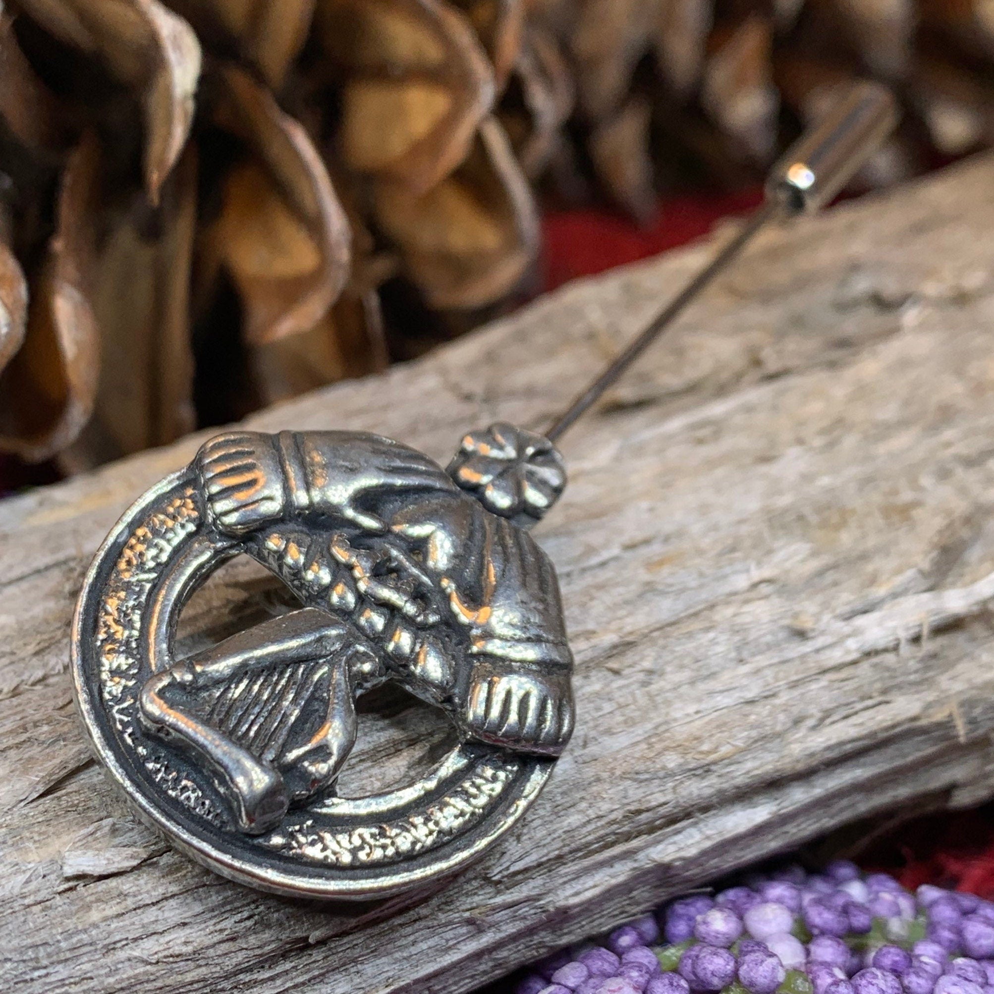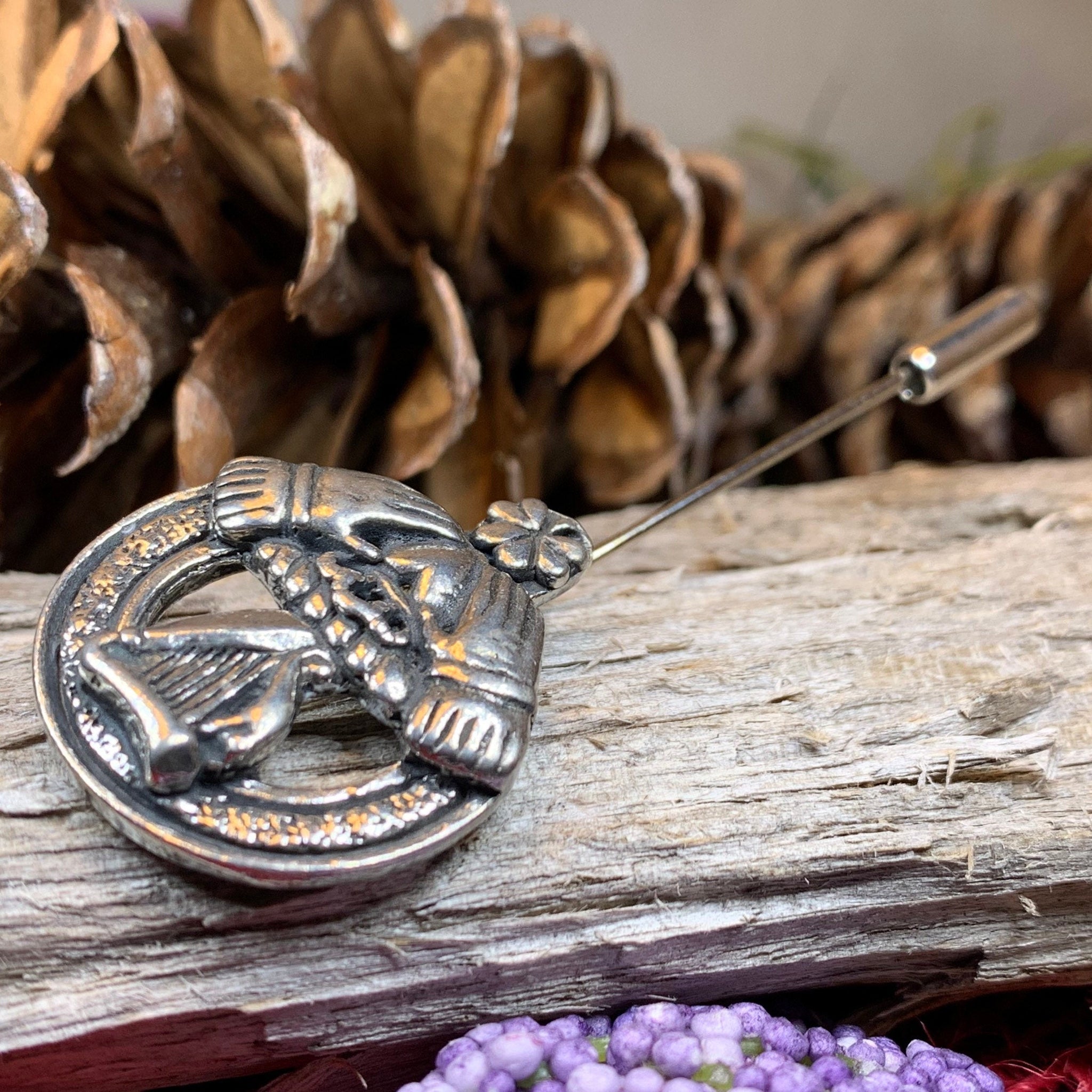 Unique antiqued pewter stick pin with a detailed Claddagh and Celtic harp - can be worn on any ladies' dress or men's jacket or even as a groom's tie pin or lapel pin for a man's suit. A perfect love gift!