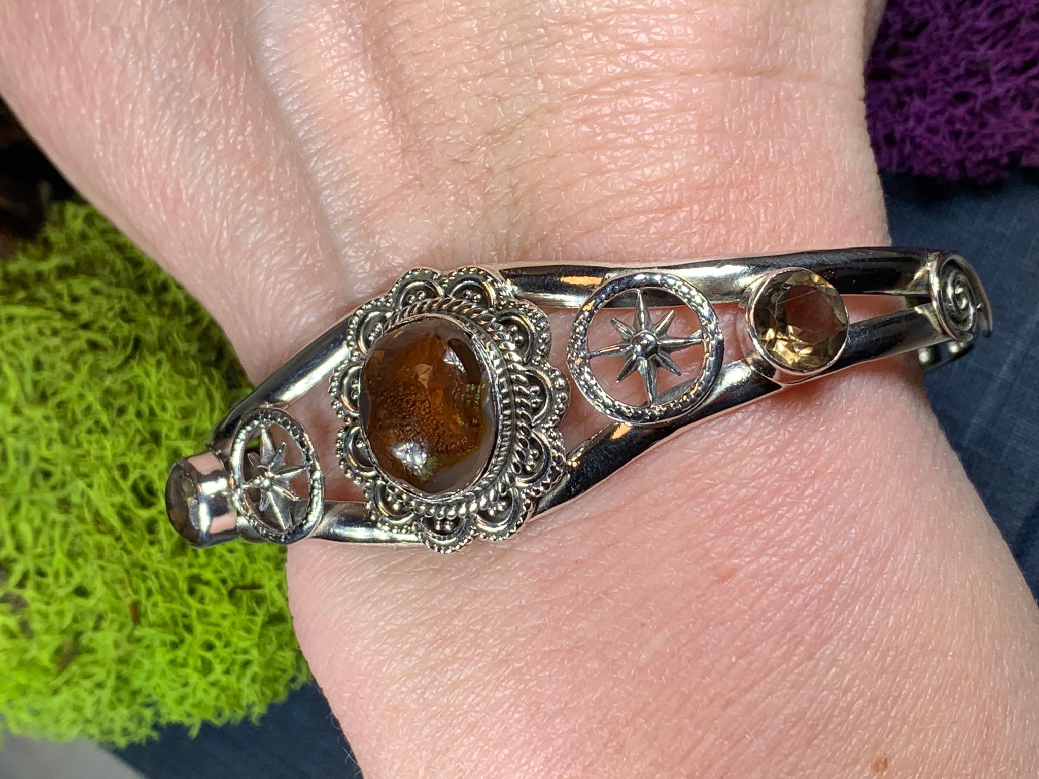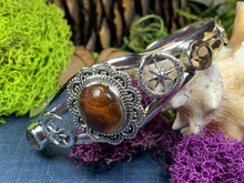 Solid pewter with opening in the back - cuff style bracelet is adjustable up to 1/2 inch. Design at front is 1" wide.