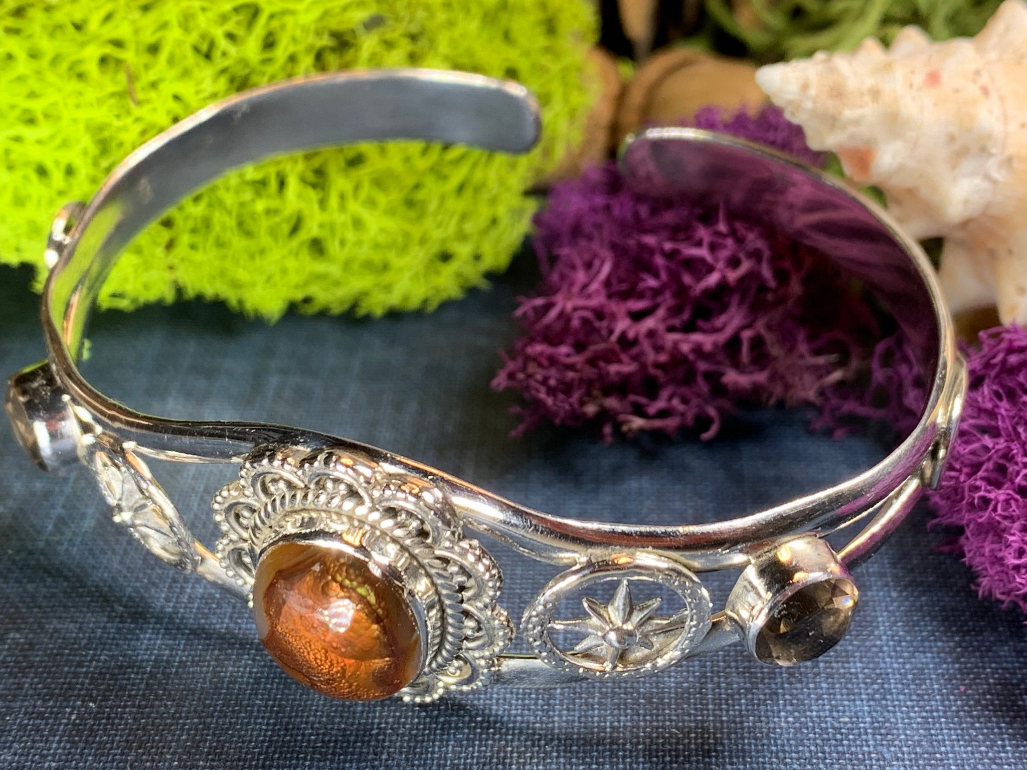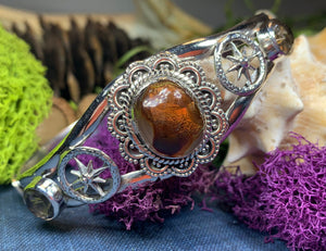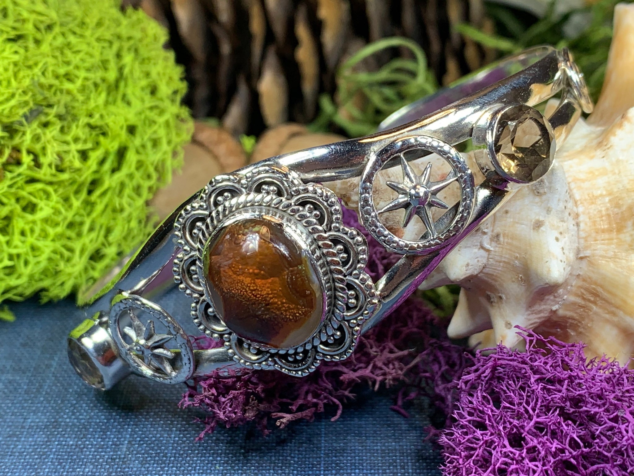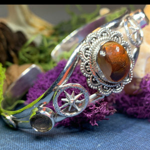A fantasy of a bracelet with a large center Celtic spiral and detailed Celtic knot work adorning each side ...both sides of the bracelet taper down at the back for comfortable wear.