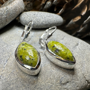 These earrings are a work of art! A large three carat, authentic Connemara marble cabochon from Ireland bezel set into sterling silver. These earrings include a lever back closure for ease of wear.