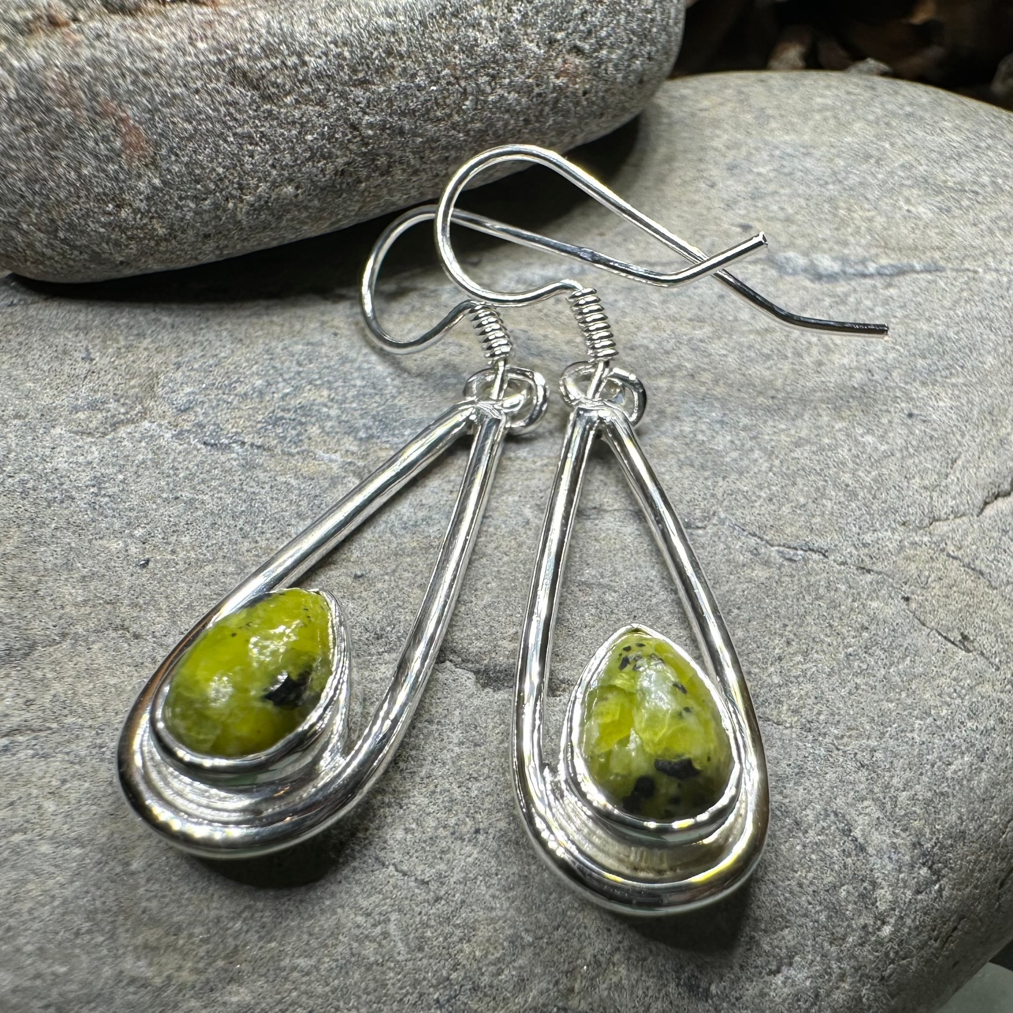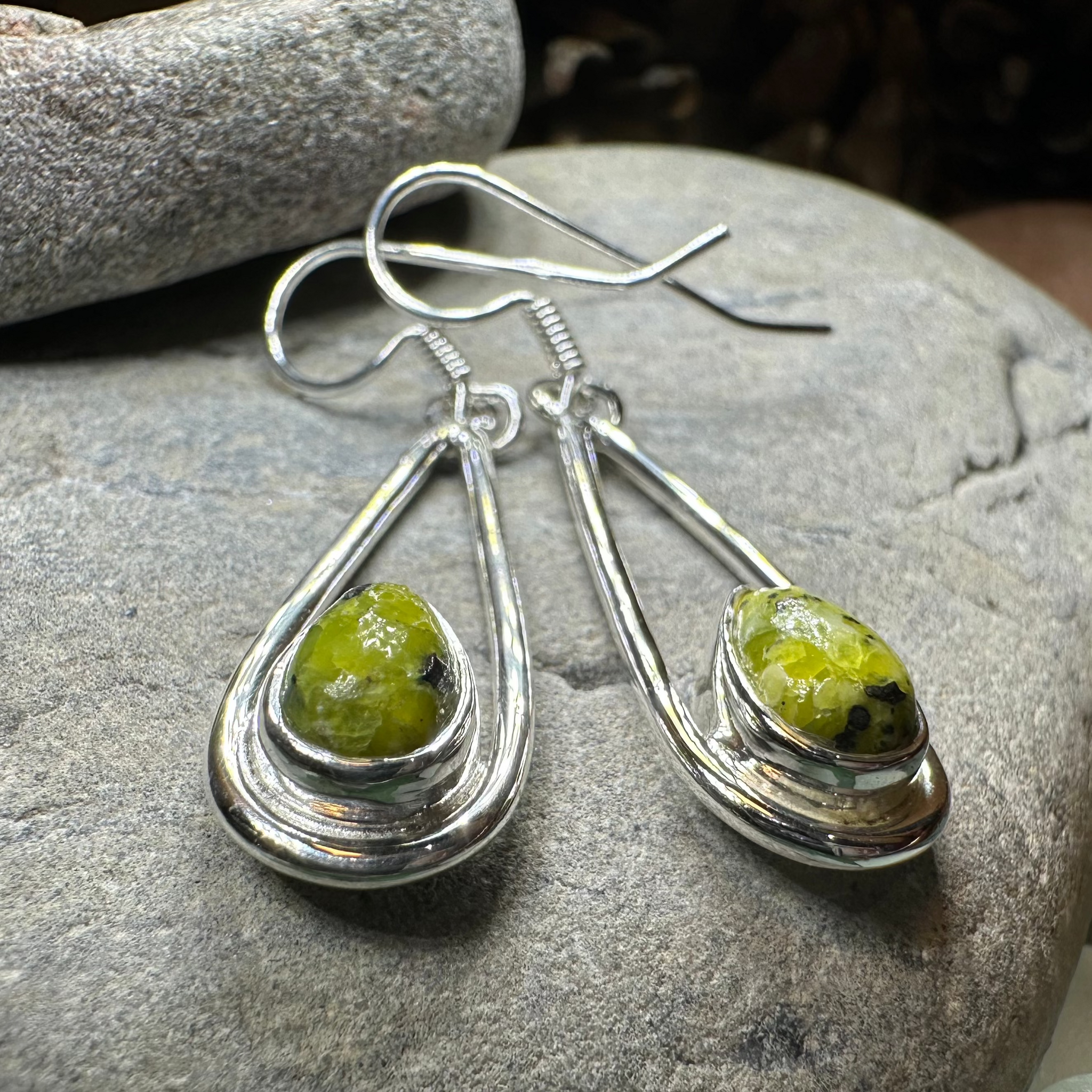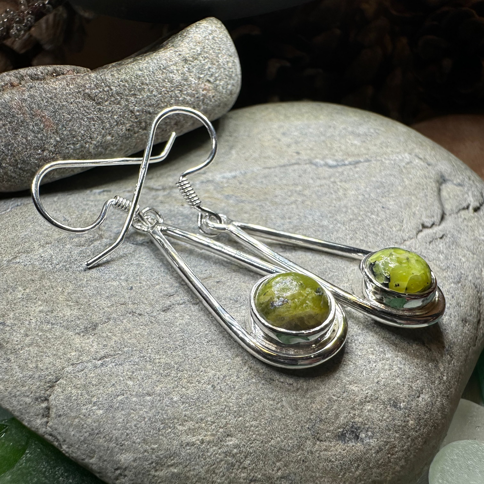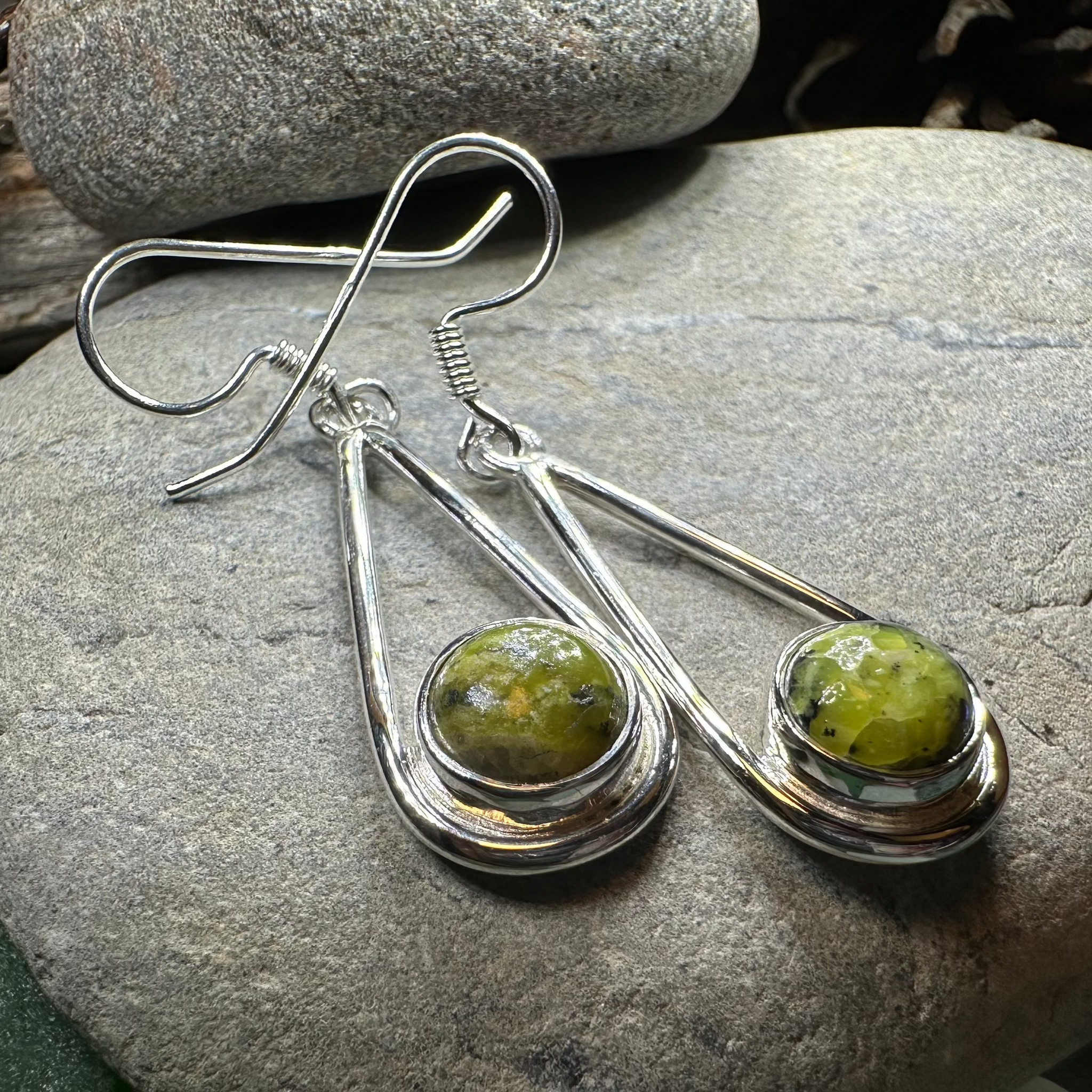 These earrings are a work of art! A one carat, authentic Connemara marble cabochon from Ireland bezel set into sterling silver. These earrings include a lsterling silver hook closure for ease of wear.