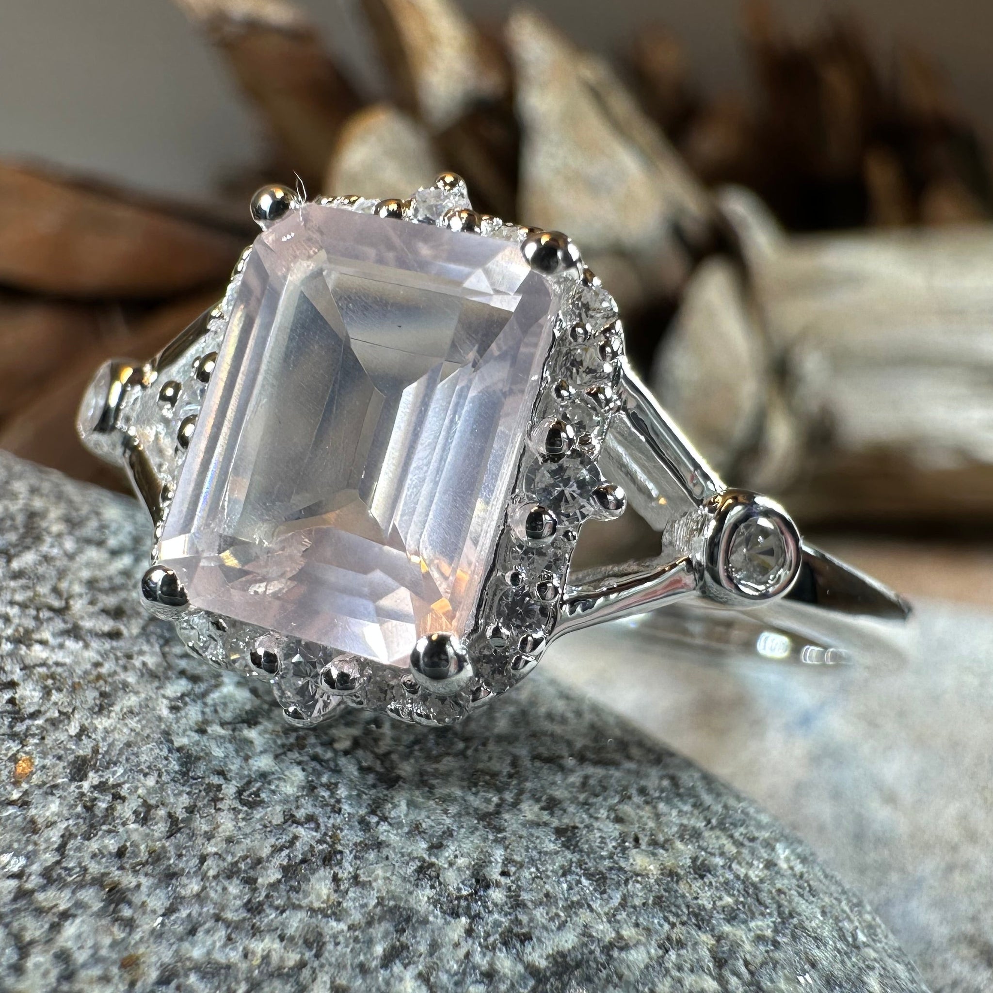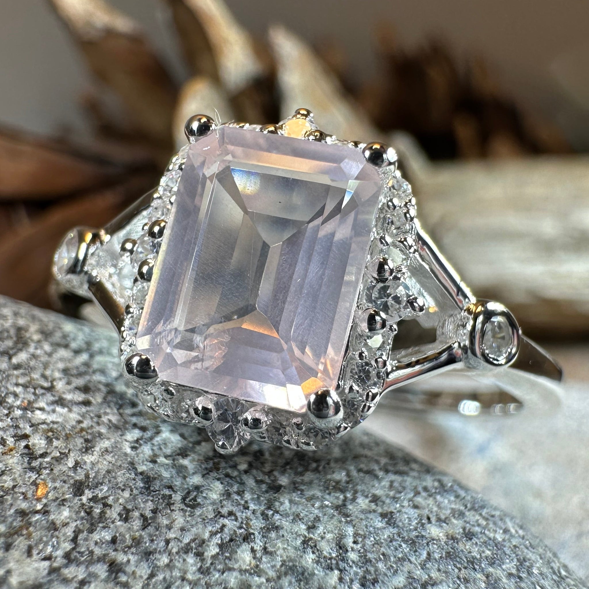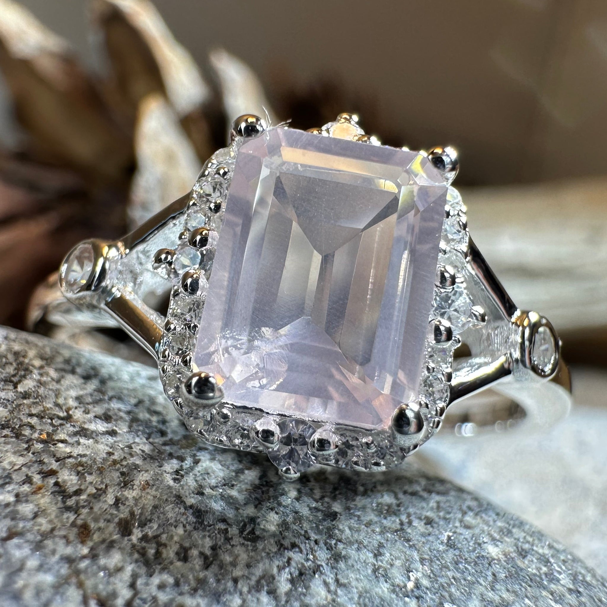 This Solid Sterling Silver Rose Quartz ring with a large 2.5 carat emerald cut, faceted Rose Quartz. This ring is hard to miss on your hand!