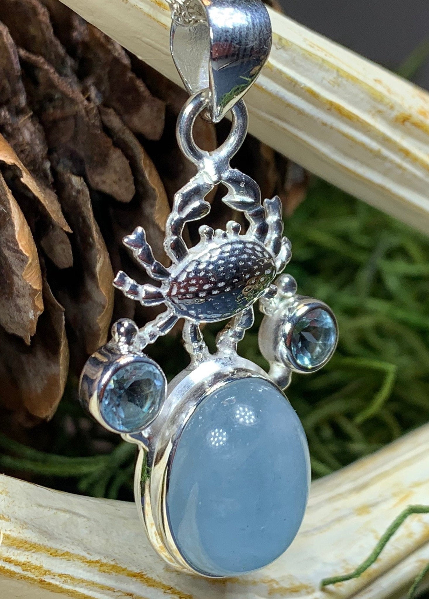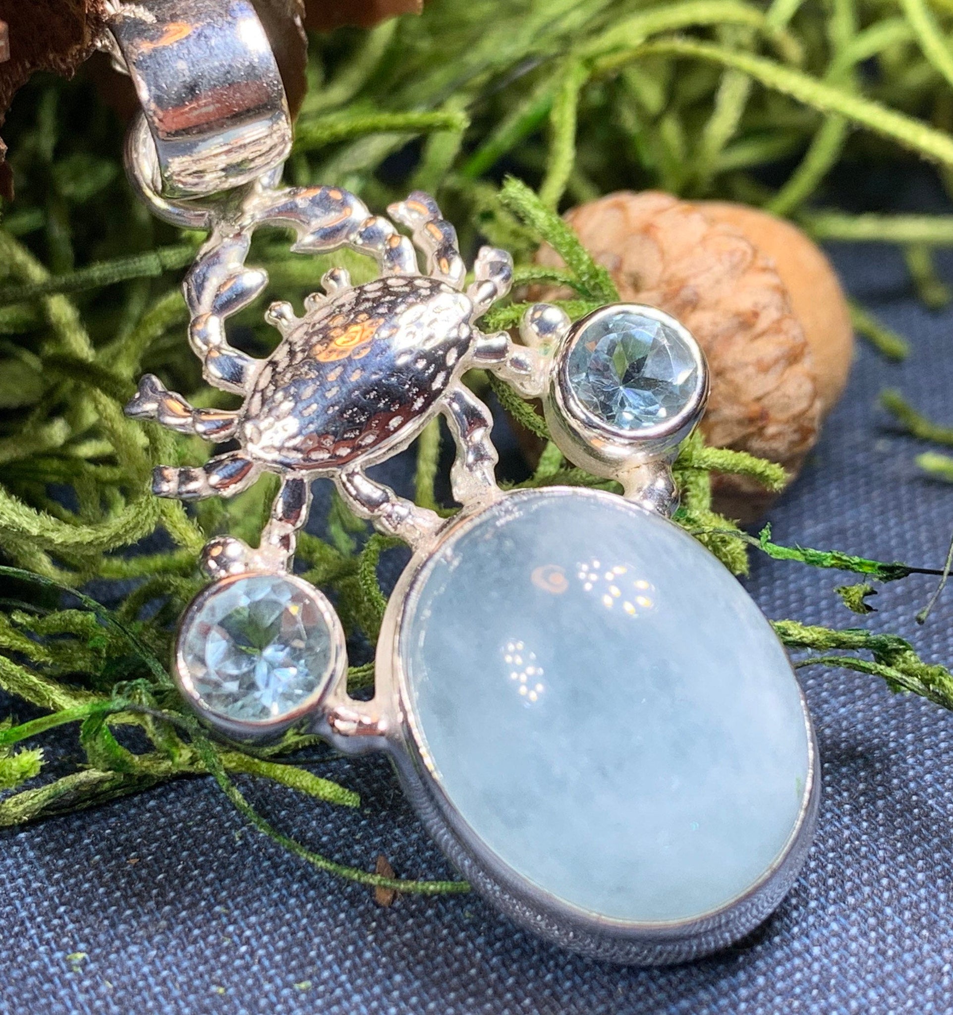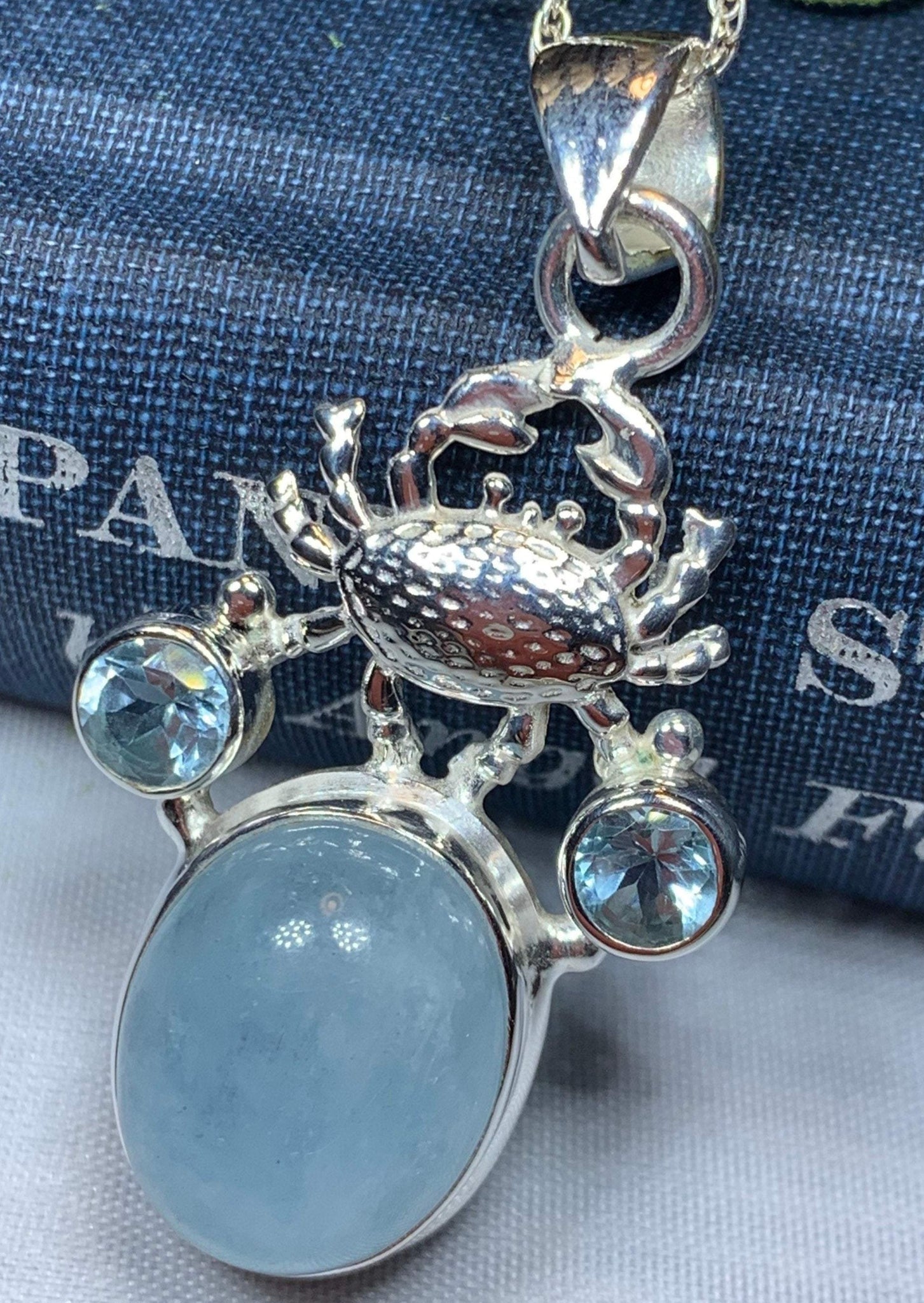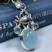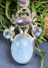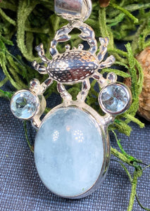 This beautiful Celtic Crab necklace has the blue glow of a 10 carat aquamarine stone with a solid sterling silver crab and setting - the large natural aquamarine stone is set around sky blue topaz stones to create an eye-catching design for your loved one!