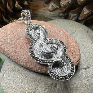 This solid sterling silver pendant, handcrafted with elegant lines and adorned with dazzling marcasite gemstones, is the ideal present for those with a passion for Irish music or those in the music industry.