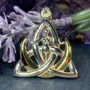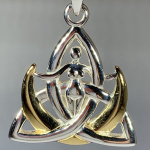 This Triple Moon Goddess is adorned with Celtic moon accents and a 18k gold plated crescent moon center - an artful rendition of an ancient Celtic Knot work design.