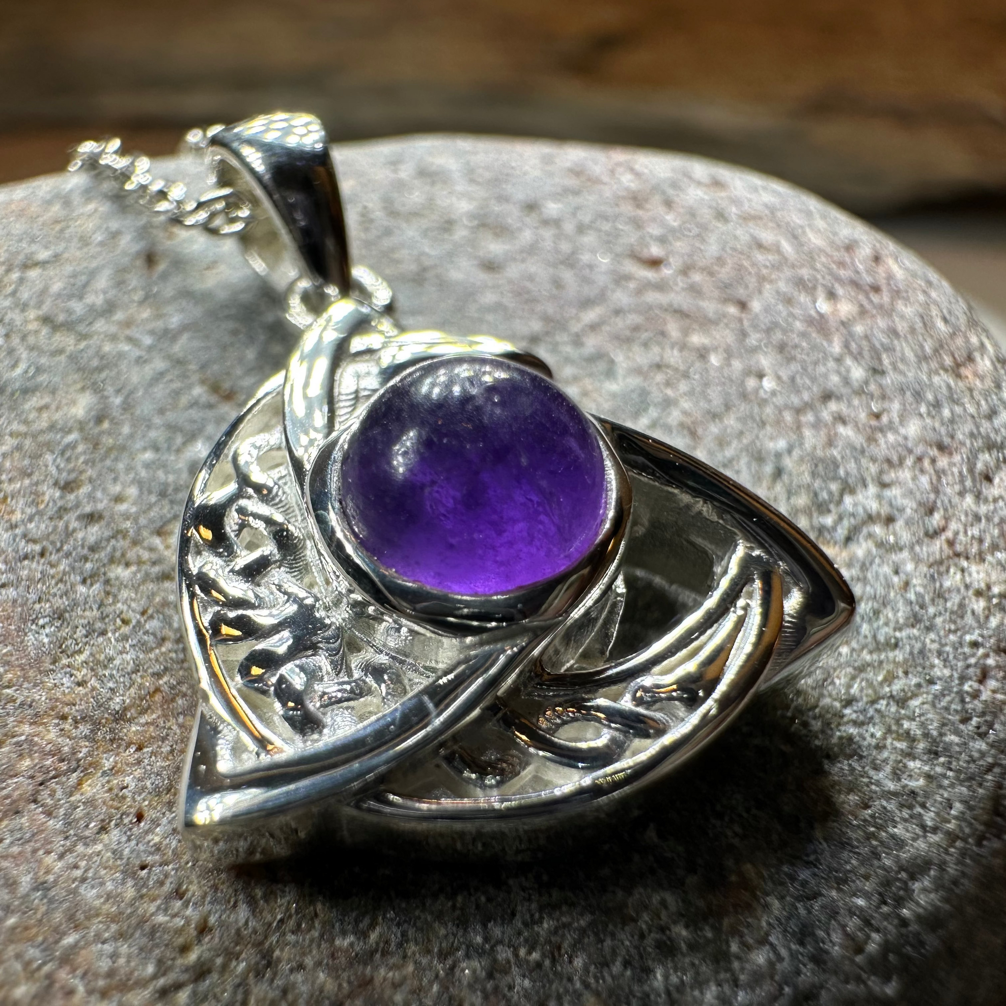 A beautiful symbol of the feminine forces in the world! This solid sterling silver crescent moon surrounded by a Celtic trinity knot is set with a beautiful moonstone, rose quartz or amethyst cabochon at its center.