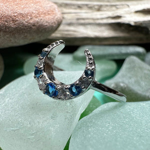 A unique design of a mystical crescent moon accented with bright clear and royal blue cubic zirconia stones - a delicate and feminine ring that celebrates the power of a woman- solid sterling silver.