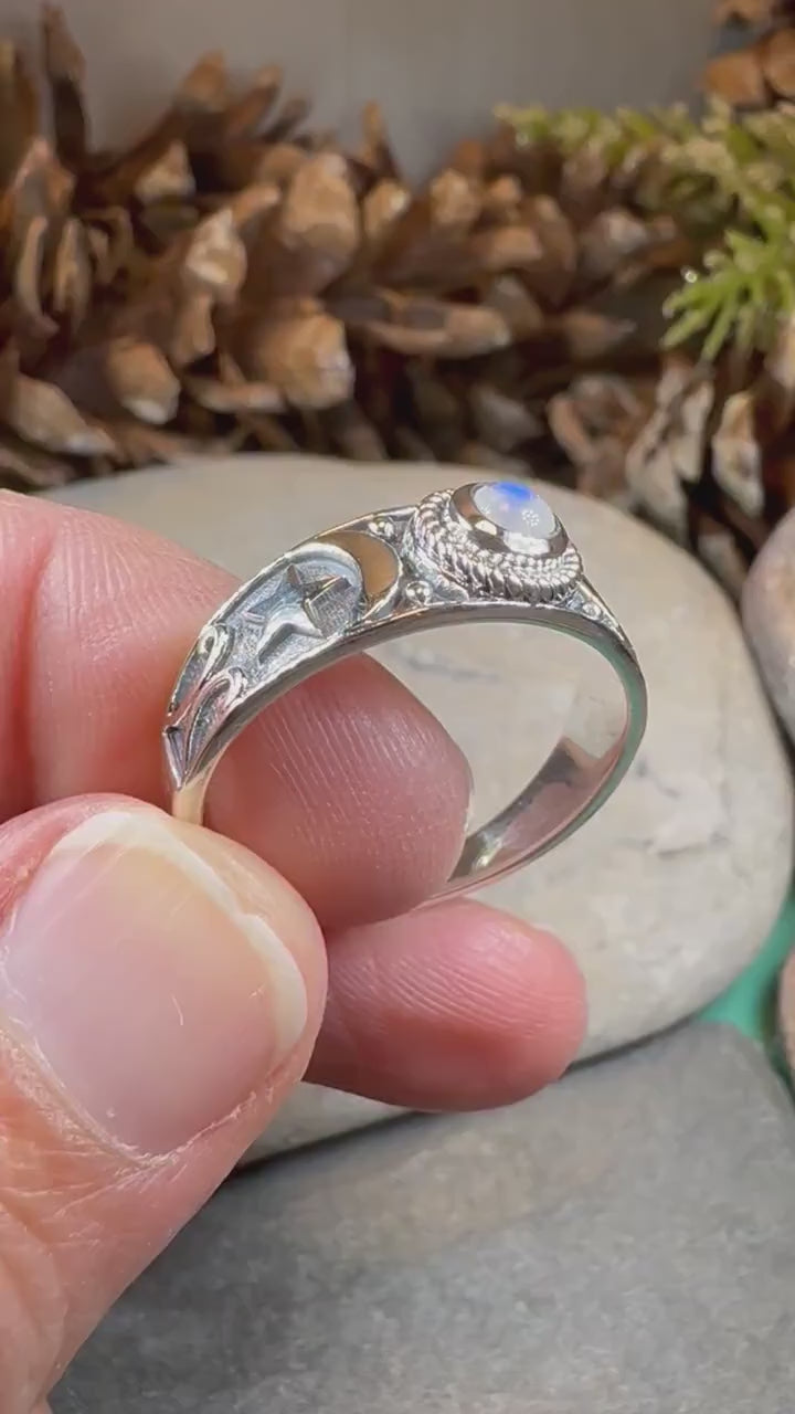 Solid Sterling Silver Moonstone Moon & Star Ring - hallmarked .925 on inside band