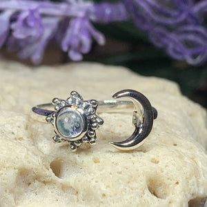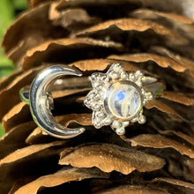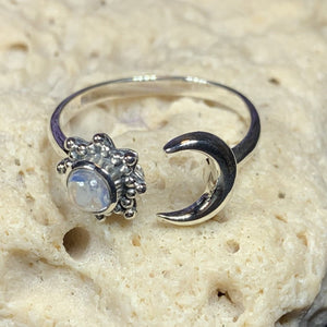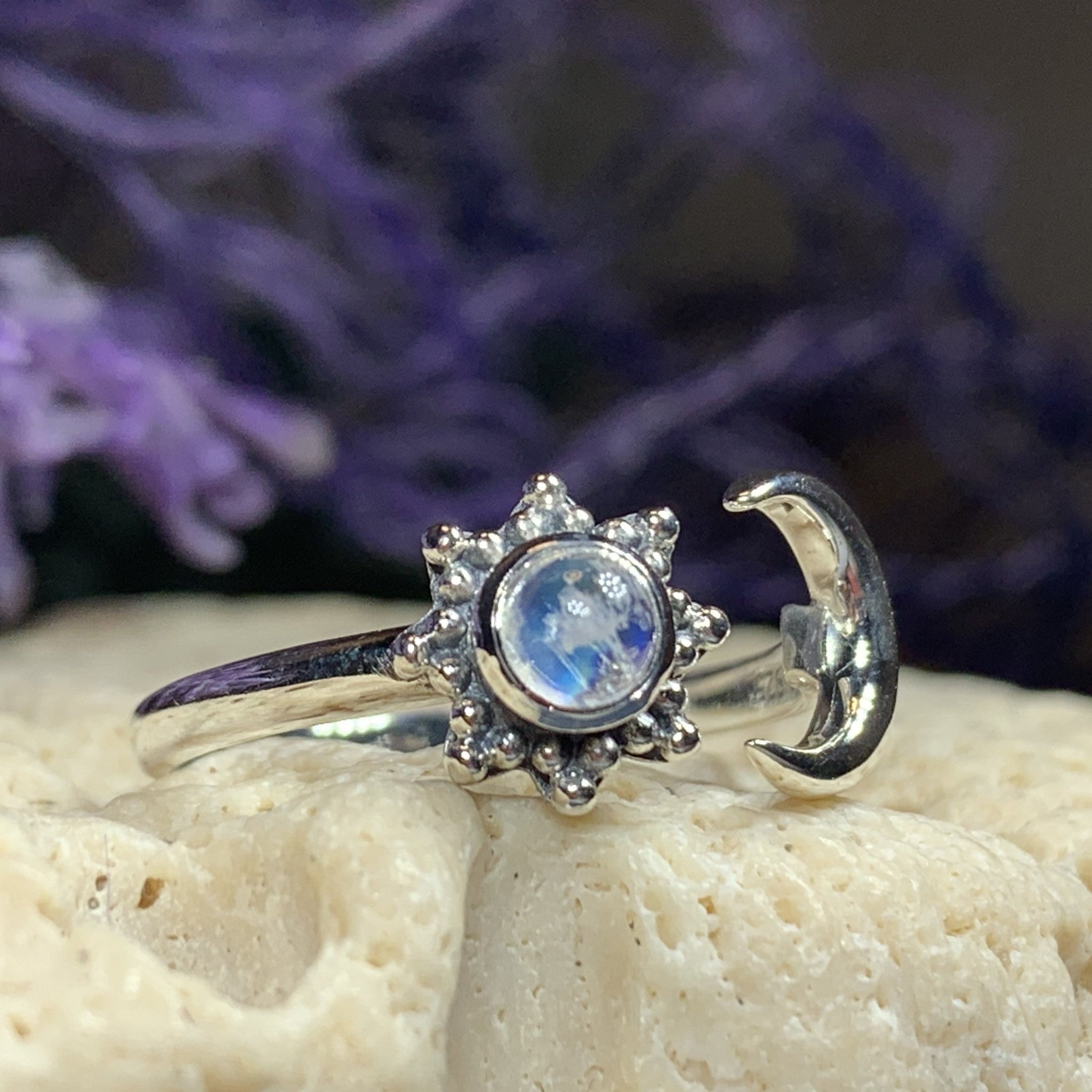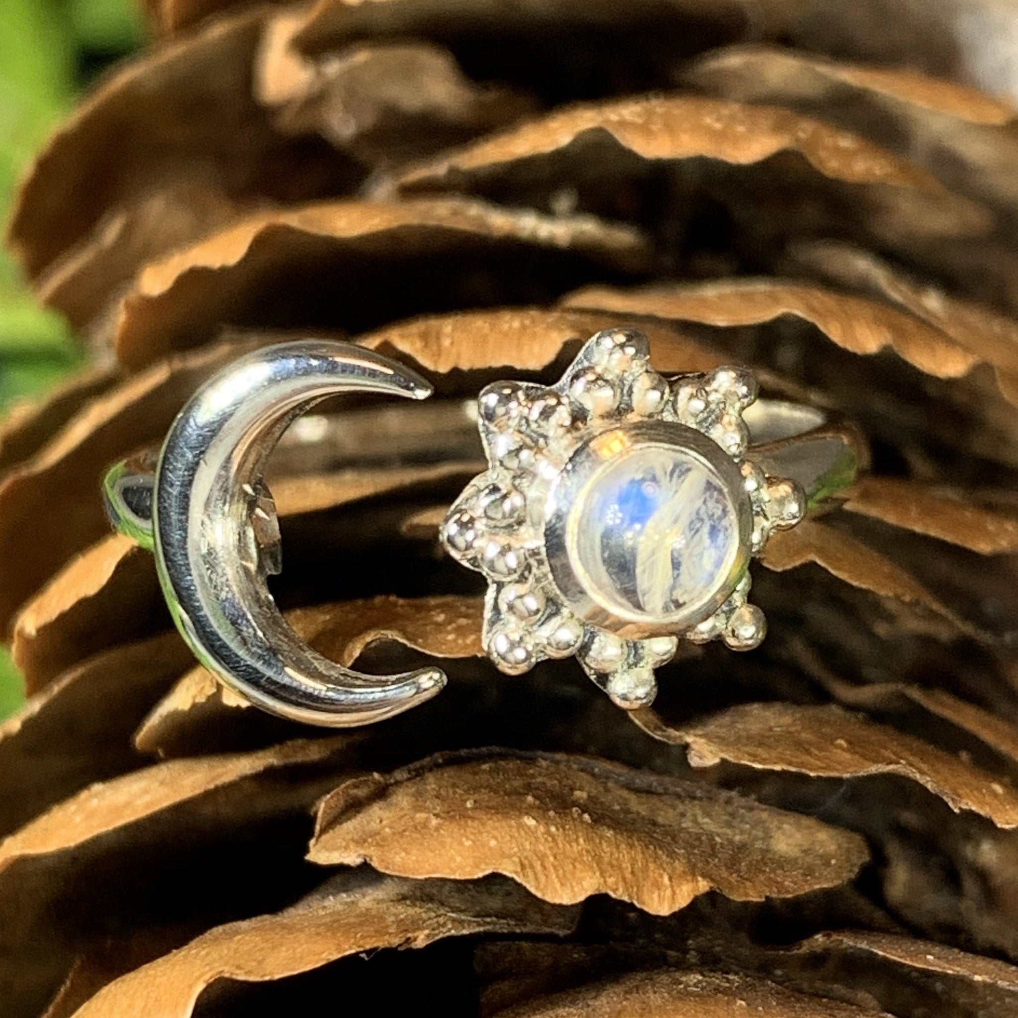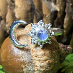 Solid sterling silver Elven Star with authentic rainbow moonstone cabochon.