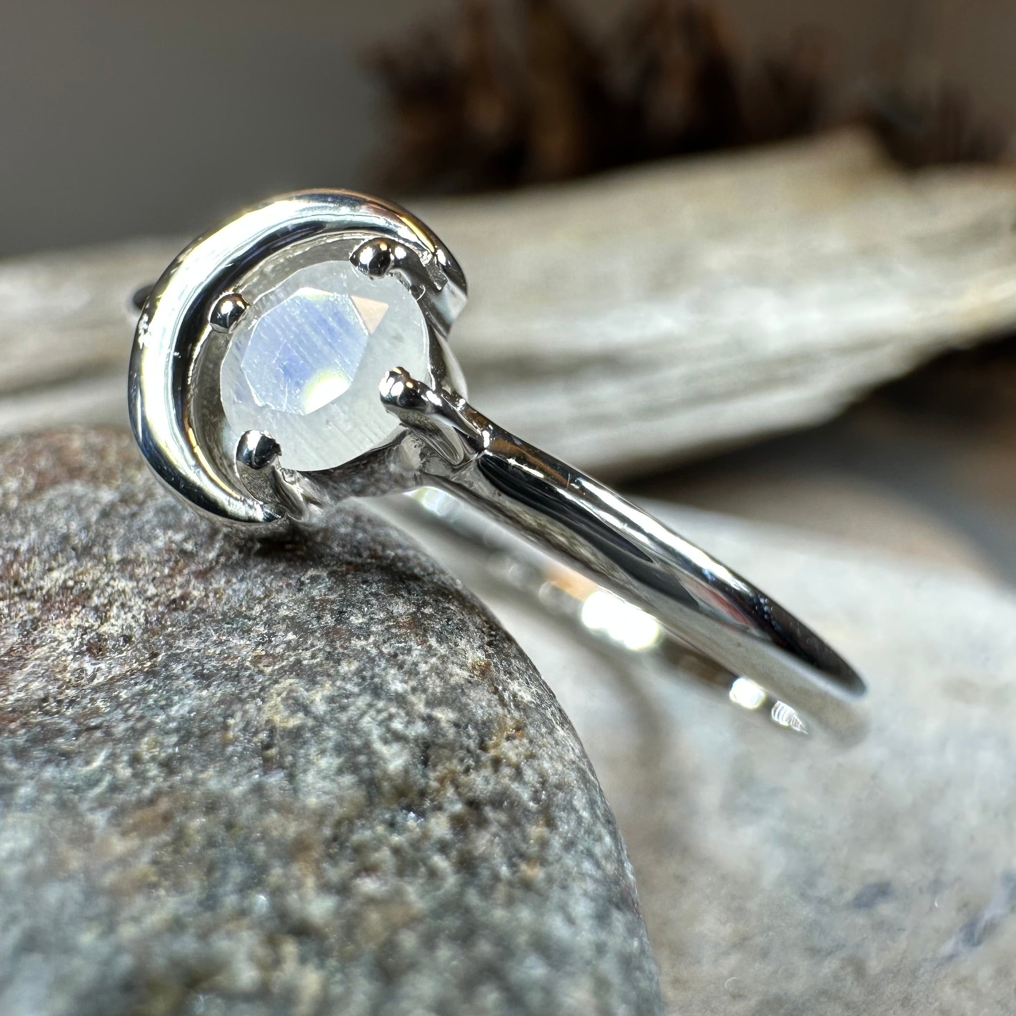 This Solid Sterling Silver Crescent Moon ring with a petite rainbow Moonstone (1/2 carat stone). The ring is set in solid polished sterling silver - an artful rendition of the traditional design.