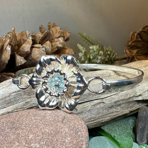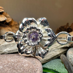 This beautiful bangle bracelet uses a traditional design featuring the daffodil, the national emblem of Wales. The daffodil is beautifully highlighted with simple lines to accentuate the natural beauty of the flower in a three demensional design - a one carat authentic gemstone is set into the center of the flower for a little sparkle and color.