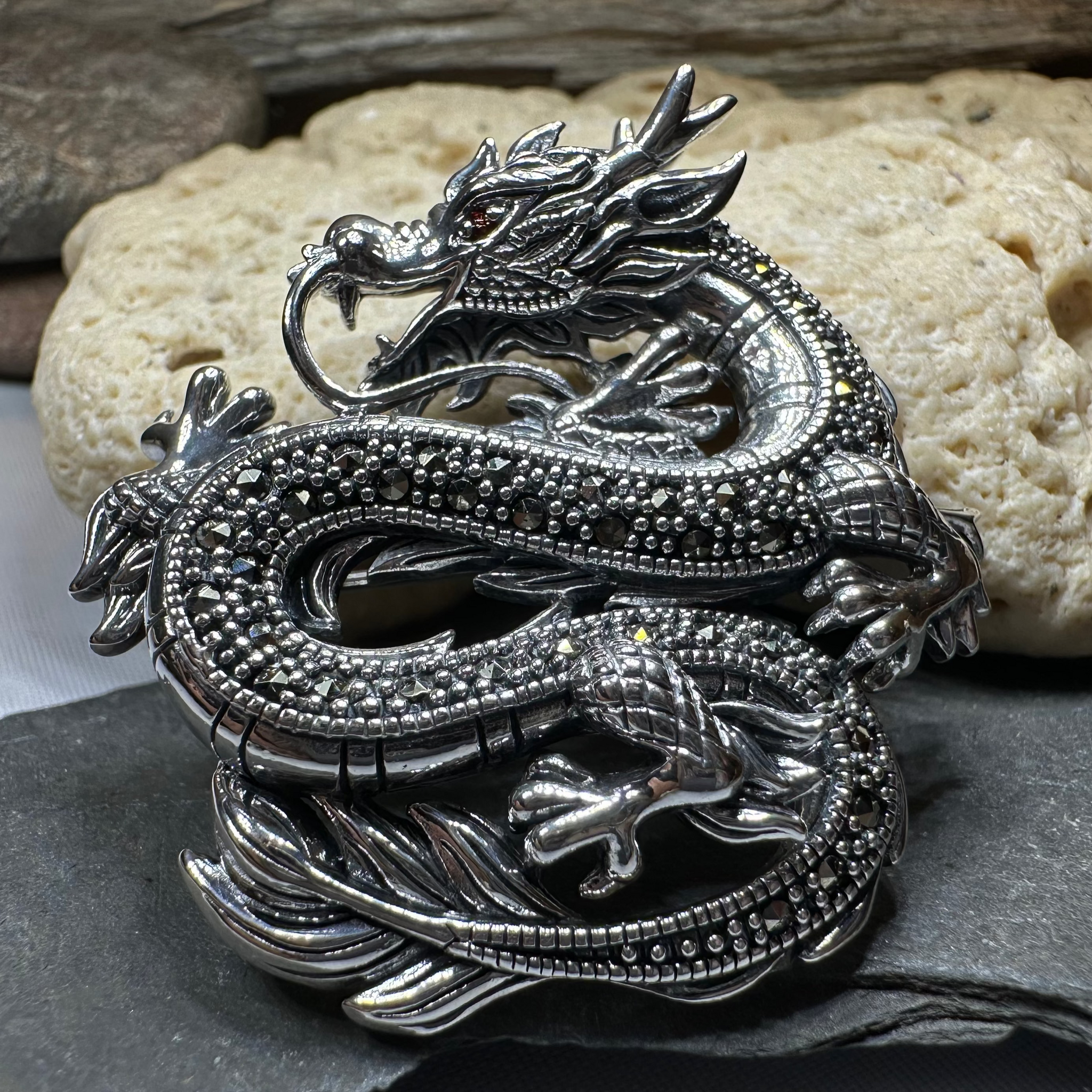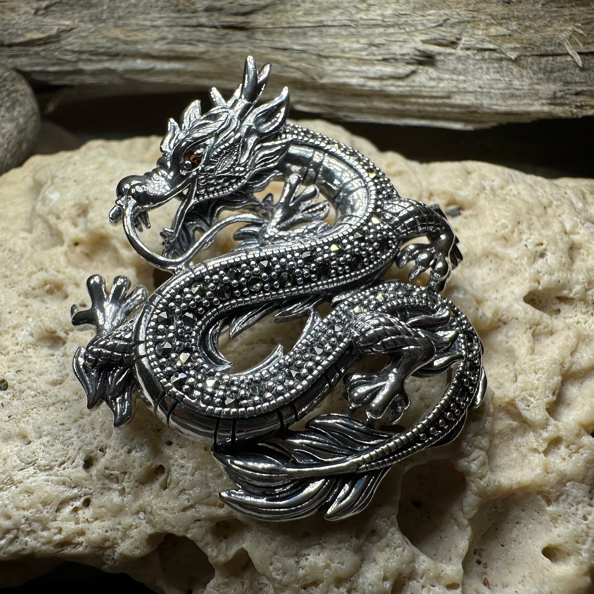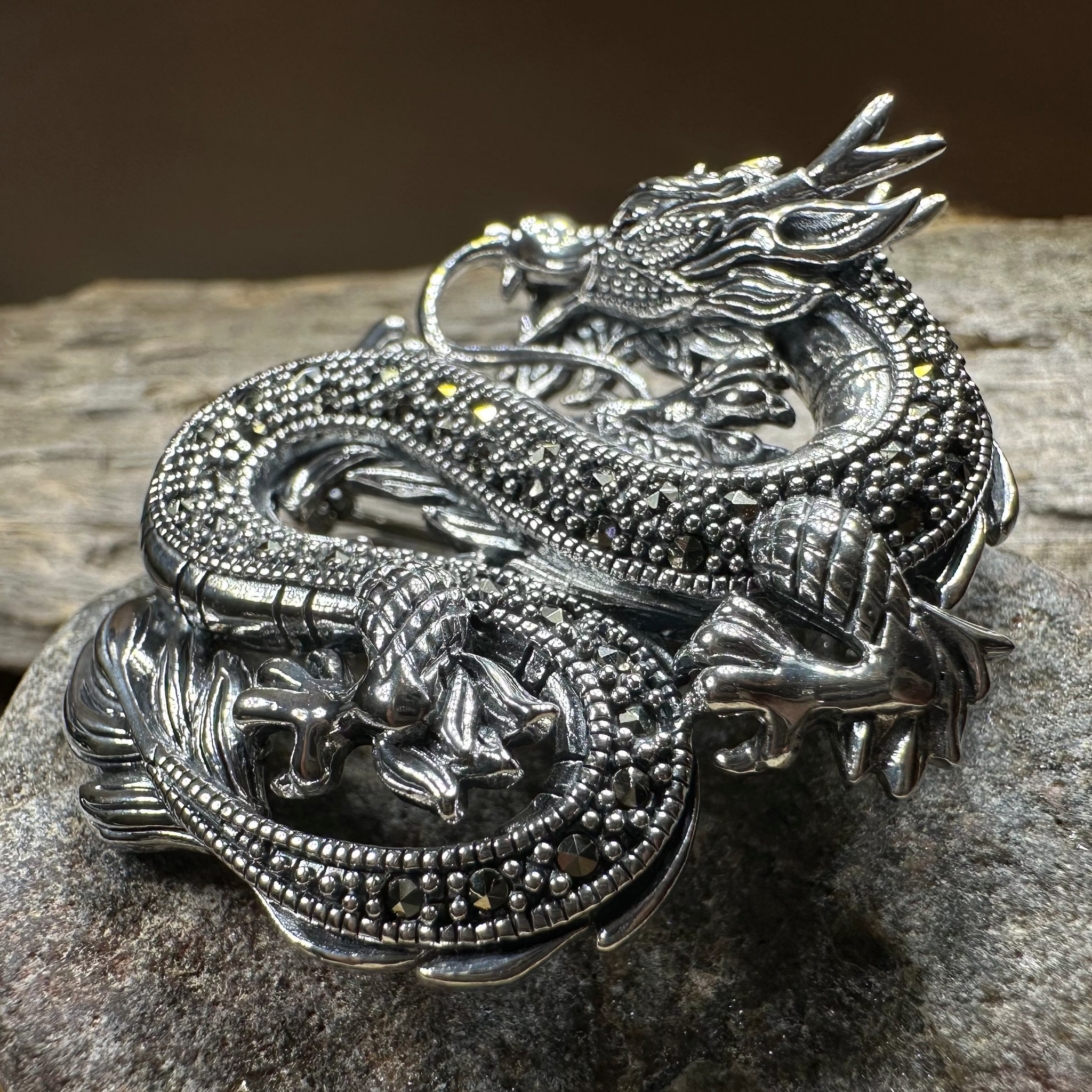 This unique piece was created with solid sterling silver and marcasite detailing to create a dramatic and magical dragon brooch that will be a special gift.